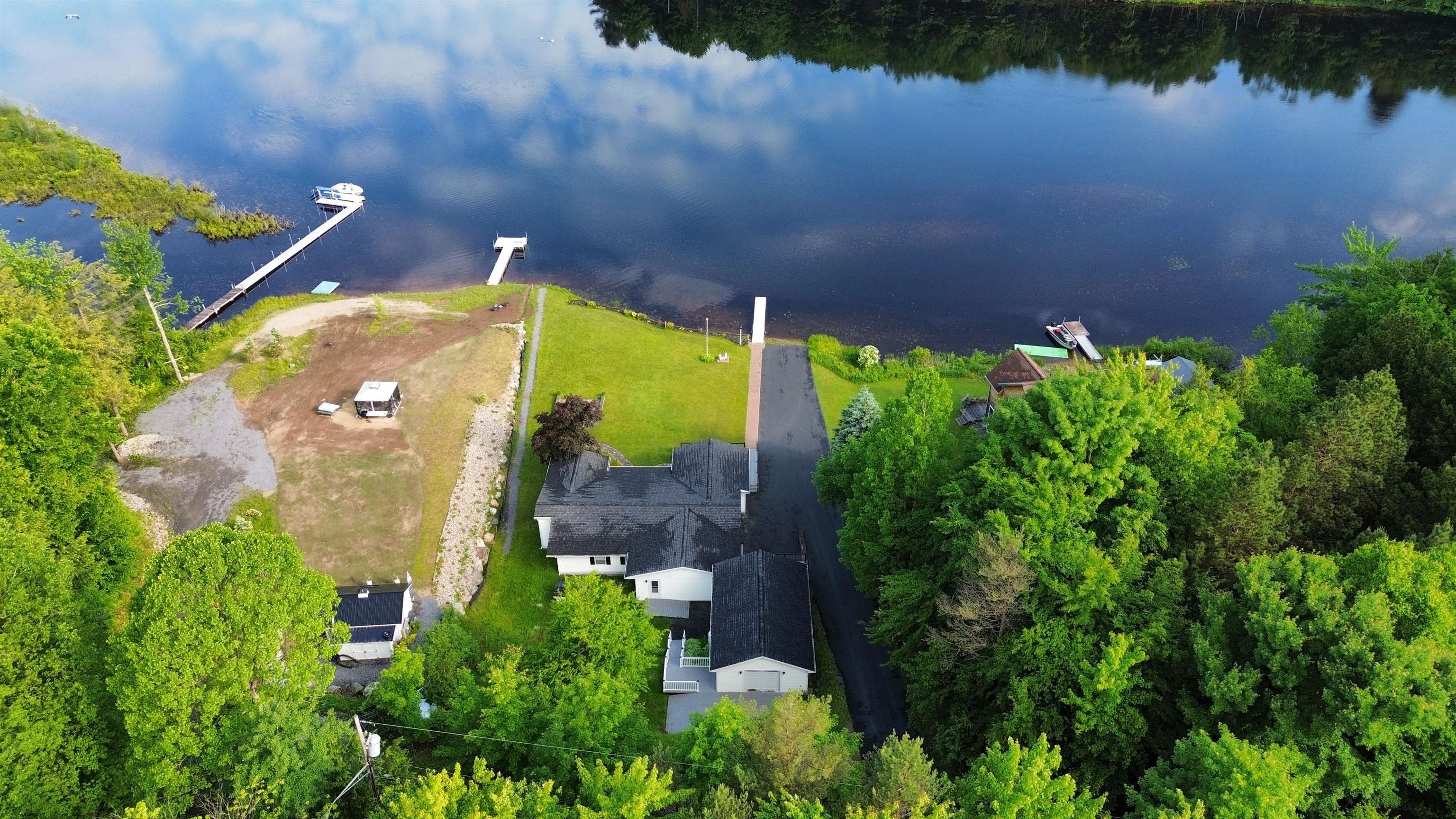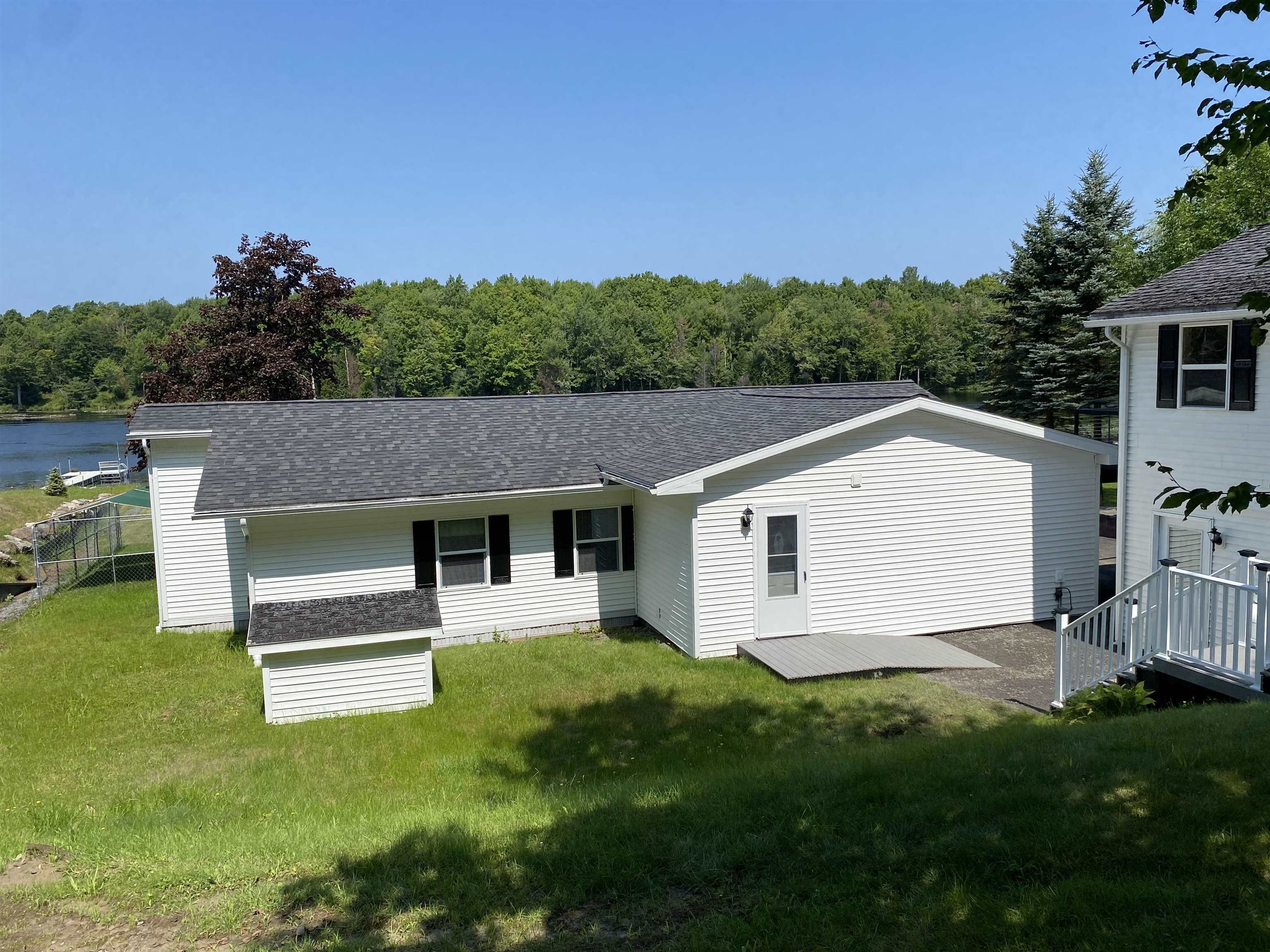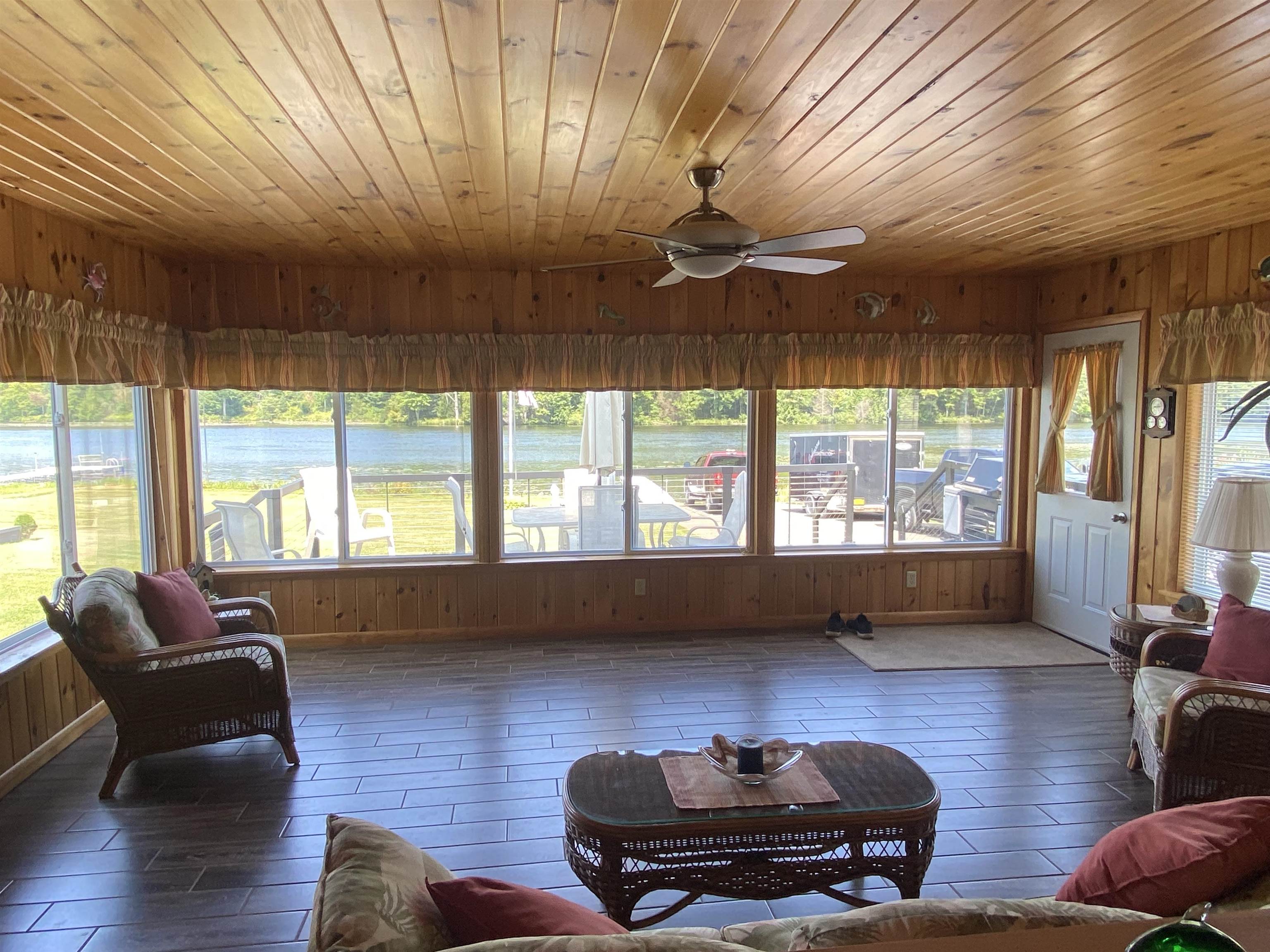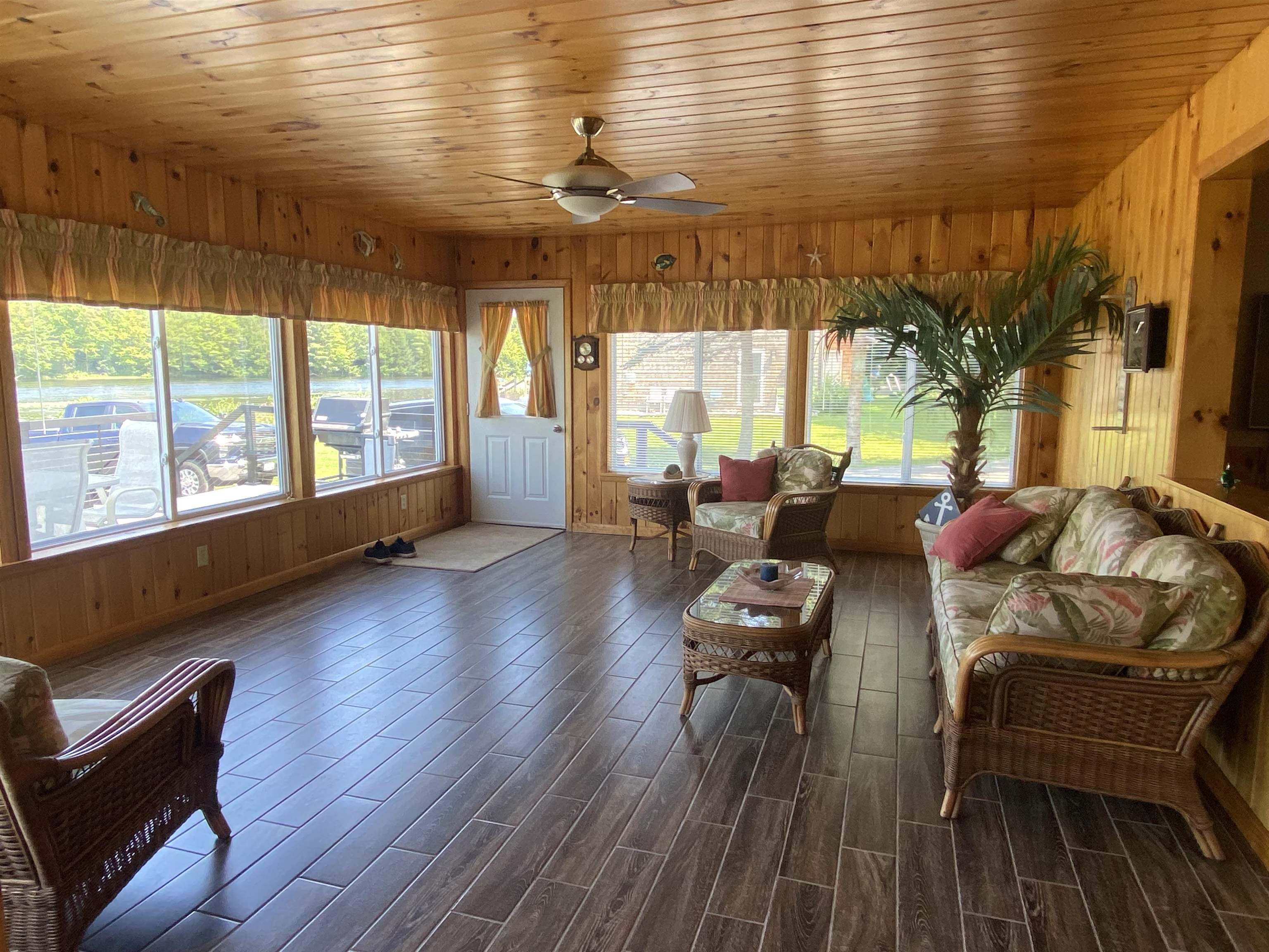Welcome to your serene waterfront retreat on Hannawa Pond/Raquette River! This charming four-bedroom, two-bathroom, single-story seasonal (but insulated) home offers the perfect blend of comfort and tranquility. A new composite deck with modern railing overlooks the lard yard and water with the peacefulness of trees across the river. A second living room/sunroom offers stunning water views and showcases a wood tile floor, wood ceiling and lots of windows. A large cased opening will bring you into the open concept dining, kitchen and living areas. The kitchen features a large island with seating for many, a gas cooktop, built-in wall oven, wine rack and beautiful cabinetry. The living room is enhanced with a decorative corner fireplace, a hidden air conditioner, and a large cased window opening into the sun room. The screen porch, featuring a vaulted knotty pine ceiling and tile flooring & wall areas, is a perfect place to unwind and enjoy the peaceful surroundings. The property boasts a spacious primary suite with an open bathroom that includes a large jetted tub and separate shower, offering a spa-like retreat. The second bedroom has French doors leading to the great screen room and there are two additional smaller bedrooms to provide cozy accommodations. Additionally, the home features a main floor laundry room with an extra fridge and sink, conveniently located off the back door. The property also includes a detached garage with a versatile second-floor space adding more that 500 sq. Ft. Of additional space! It that has both a man door and garage door. This space is perfect for a bunk room, entertainment area, workshop, or whatever fits your needs. Off the upstairs garage door is a landing with a ramp on the back side and a front balcony for added convenience and charm. The downstairs garage has a poured foundation and is large enough to fit most vehicles or maybe a boat for winter storage. Outdoor living is at its finest here with a new deck (2024) overlooking the expansive front yard and waterfront. A paved driveway (sealed in 2024) extends all the way to the water, doubling as a boat launch, making it easy to enjoy the pond. There is no public boat launch on this water, so this is a great asset to the property. A paver path leads to a cozy fire pit area with stone flooring and low walls, perfect for evenings spent under the stars. Don’t miss the opportunity to own this peaceful waterfront escape...with no neighbors across the water from you! Please make an appointment to see the property & do not drive down without one. Thank you