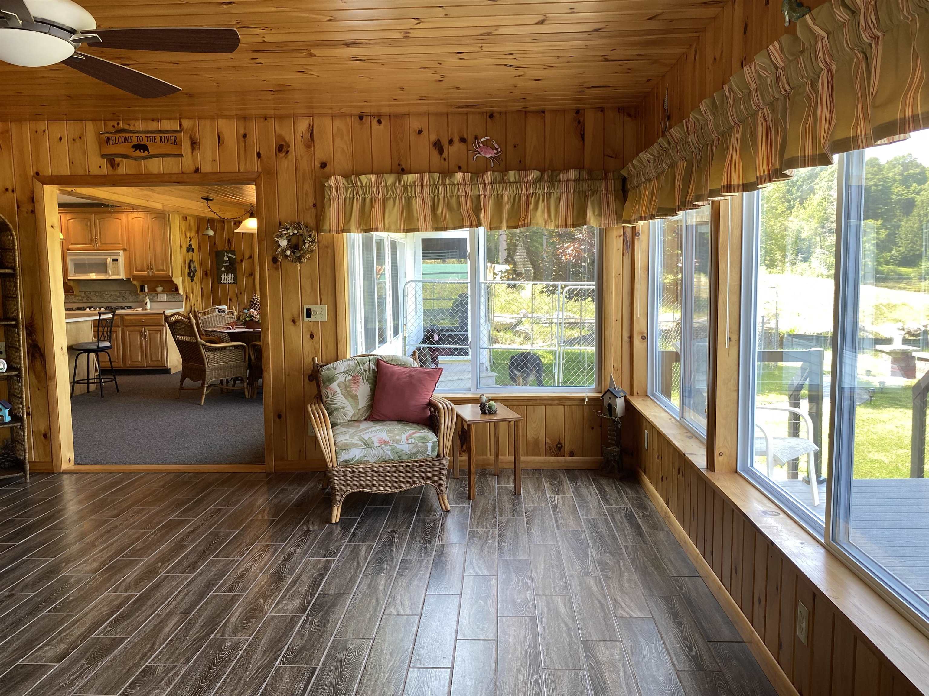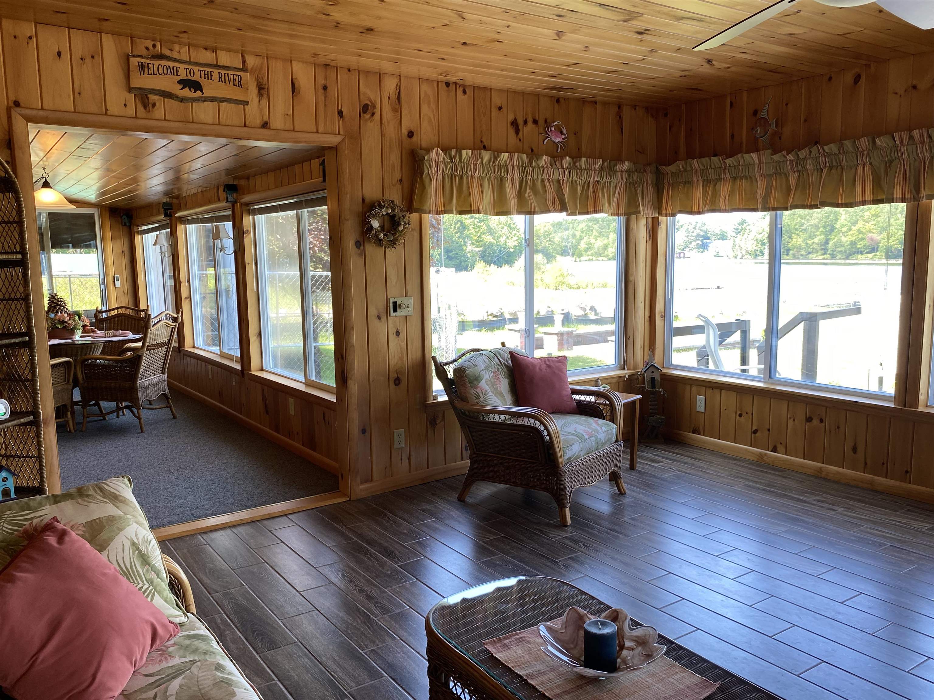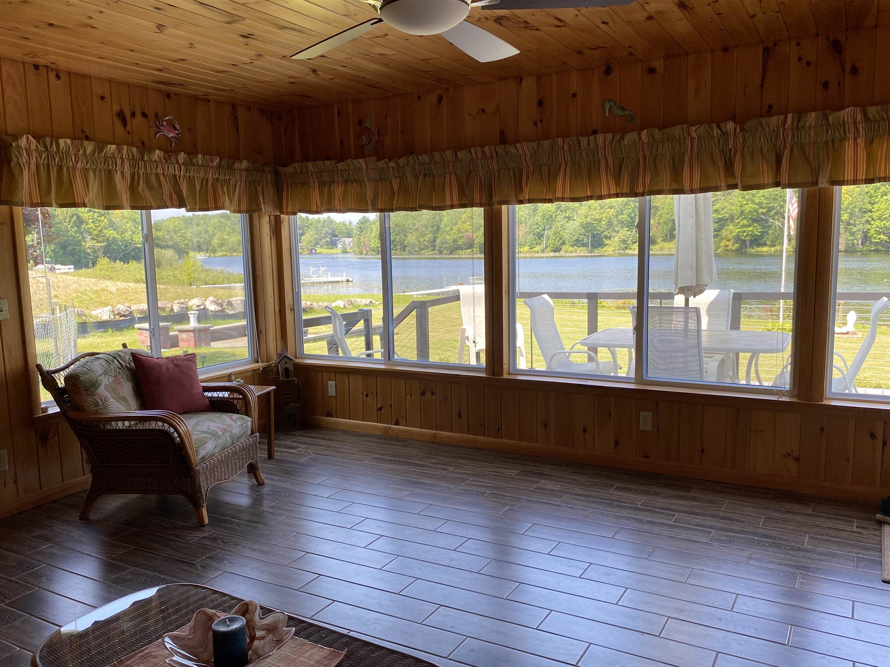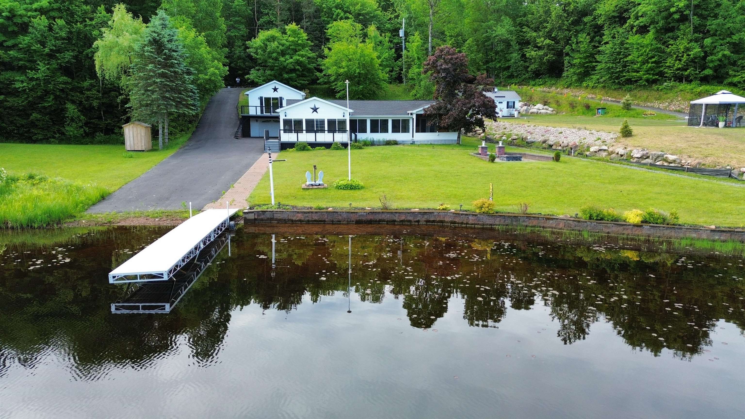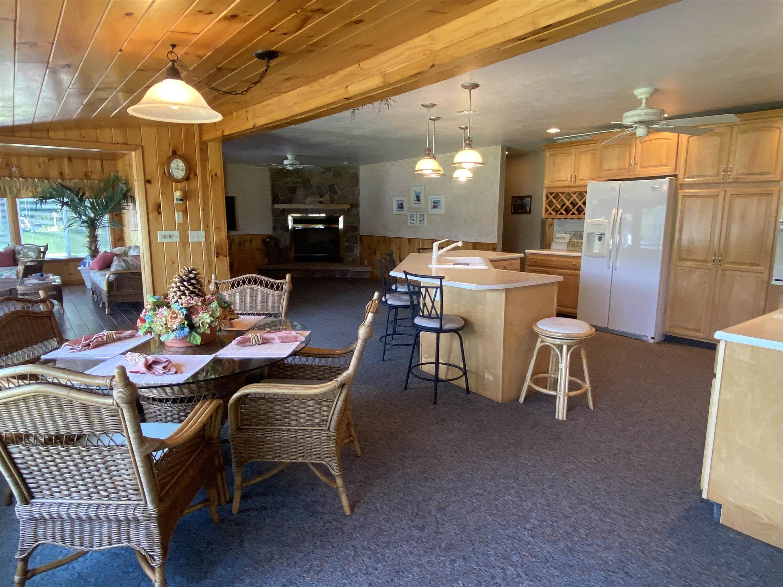Welcome to your serene waterfront retreat on Hannawa Pond/Raquette River! This charming four-bedroom, two-bathroom, single-story seasonal (but insulated) home offers the perfect blend of comfort and tranquility. A new composite deck with modern railing overlooks the lard yard and water with the peacefulness of trees across the river. A second living room/sunroom offers stunning water views and showcases a wood tile floor, wood ceiling and lots of windows. A large cased opening will bring you into the open concept dining, kitchen and living areas. The kitchen features a large island with seating for many, a gas cooktop, built-in wall oven, wine rack and beautiful cabinetry. The living room is enhanced with a decorative corner fireplace, a hidden air conditioner, and a large cased window opening into the sun room. The screen porch, featuring a vaulted knotty pine ceiling and tile flooring & wall areas, is a perfect place to unwind and enjoy the peaceful surroundings. The property boasts a spacious primary suite with an open bathroom that includes a large jetted tub and separate shower, offering a spa-like retreat. The second bedroom has French doors leading to the great screen room and there are two additional smaller bedrooms to provide cozy accommodations. Additionally, the home features a main floor laundry room with an extra fridge and sink, conveniently located off the back door. The property also includes a detached garage with a versatile second-floor space adding more that 500 sq. Ft. Of additional space! It that has both a man door and garage door. This space is perfect for a bunk room, entertainment area, workshop, or whatever fits your needs. Off the upstairs garage door is a landing with a ramp on the back side and a front balcony for added convenience and charm. The downstairs garage has a poured foundation and is large enough to fit most vehicles or maybe a boat for winter storage. Outdoor living is at its finest here with a new deck (2024) overlooking the expansive front yard and waterfront. A paved driveway (sealed in 2024) extends all the way to the water, doubling as a boat launch, making it easy to enjoy the pond. There is no public boat launch on this water, so this is a great asset to the property. A paver path leads to a cozy fire pit area with stone flooring and low walls, perfect for evenings spent under the stars. Don’t miss the opportunity to own this peaceful waterfront escape...with no neighbors across the water from you! Please make an appointment to see the property & do not drive down without one. Thank you