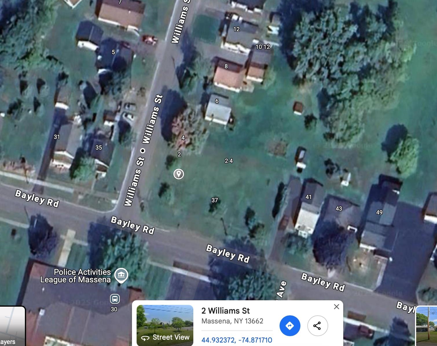 Here is your chance to purchase two rare building lots in the village of Massena at one amazing price. These two lots make up the corner of Williams Street and Bayley Road with a combined 100 feet of road frontage. The lots are zoned Residential B, but building variances can be applied for with the village of Massena for other uses such as commercial. There is electric, town water and sewer available at the road. So many options! Build your dream home on an oversized corner lot or build two homes. Opportunity awaits- what will you decide to do? Your dream home on an oversized lot with a country feel but the conveniences of village living? It is POSSIBLE!