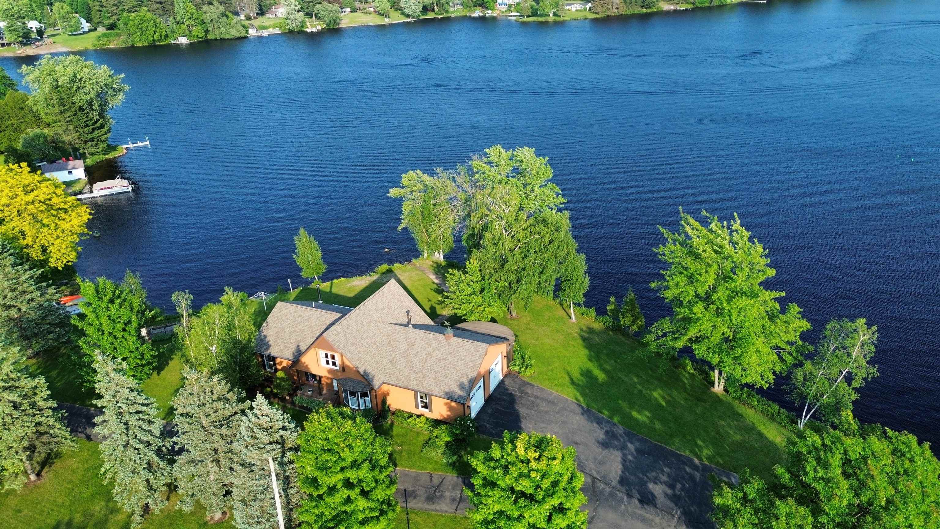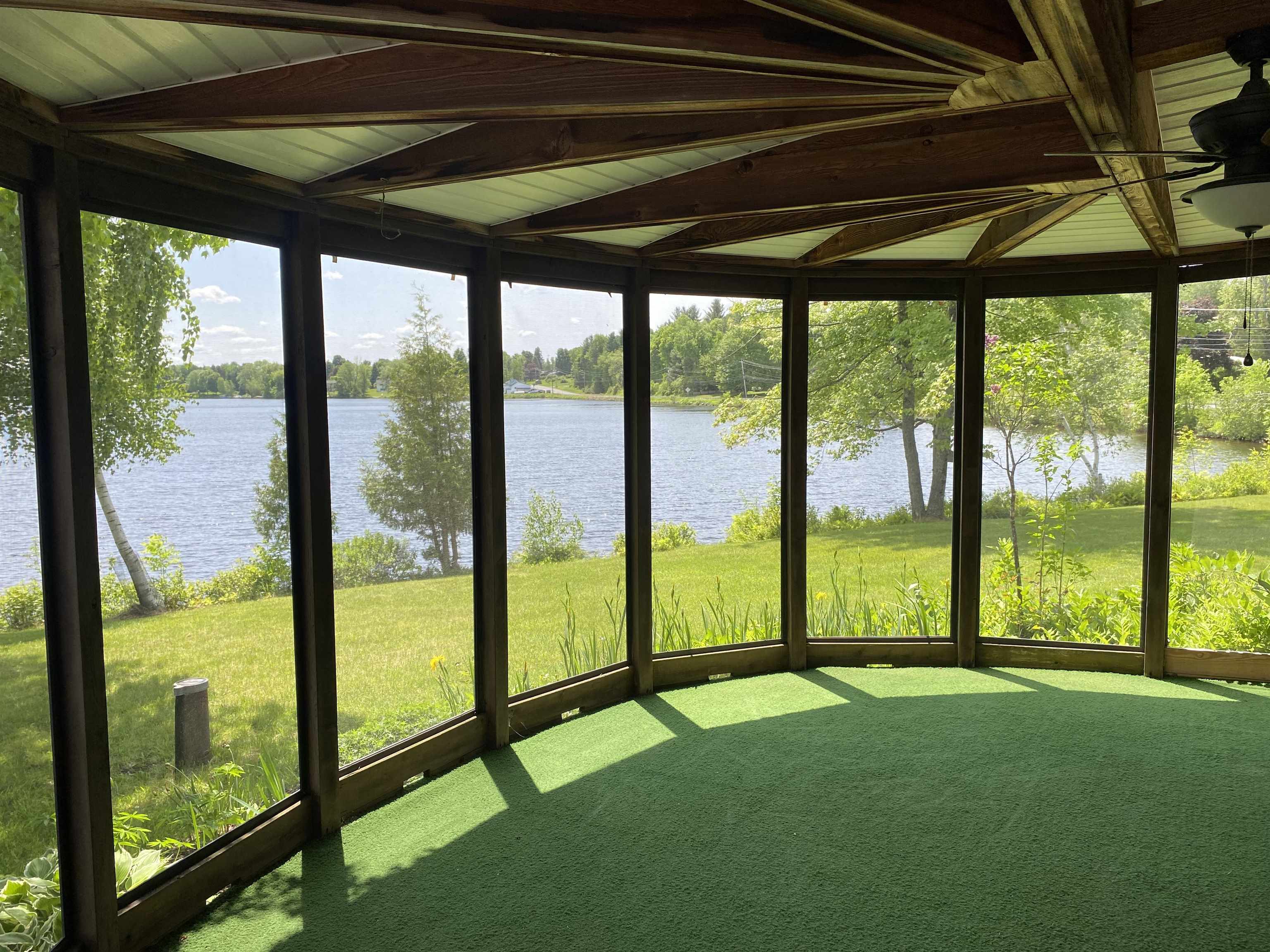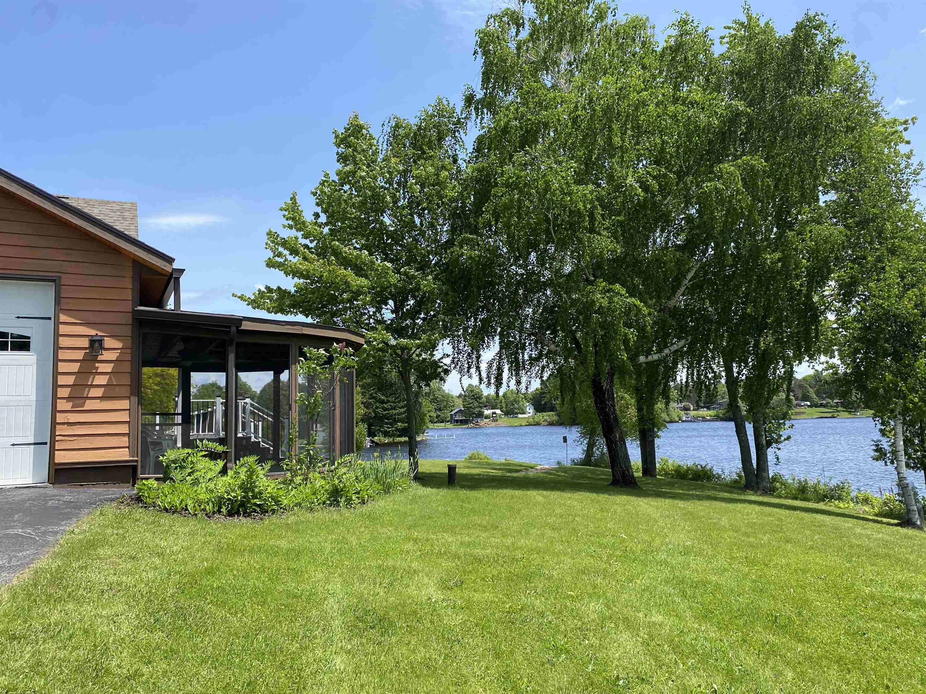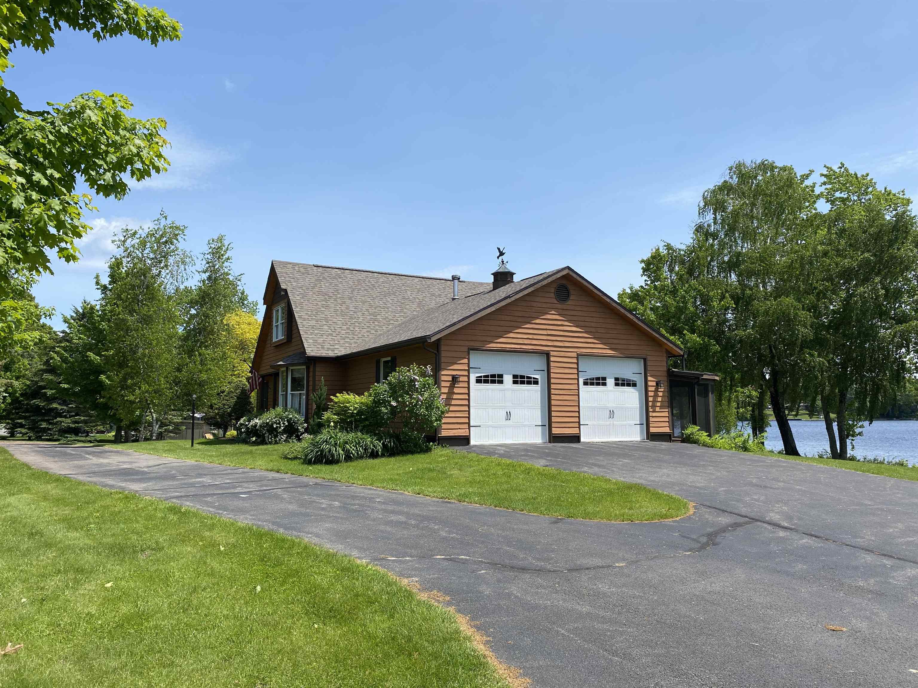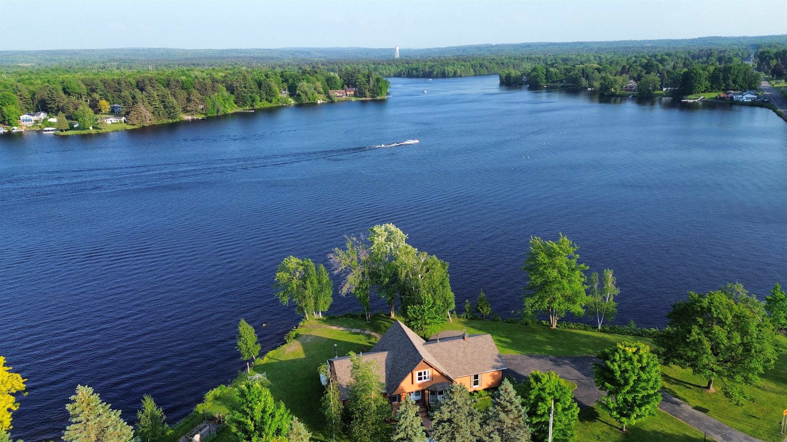 This well-maintained 3-bedroom, 2-bath home offers one of the larger water frontages on Hannawa Pond—approximately 384 feet—and a layout that blends comfort, function, and views. Outside, a new large composite deck and an arced screened porch provide excellent spaces to take in the water and surrounding landscape. A Potsdam sandstone pathway, made from reclaimed downtown sidewalk stone, leads from the deck to the shoreline. The paved wraparound driveway offers ample parking and will be sealed when weather allows. The exterior was also repainted and re-stained last year. Inside, the open-concept kitchen, living, and dining area is vaulted to a second-floor loft and filled with natural light. The updated kitchen includes stone countertops, stainless steel appliances, a breakfast bar, and a sink with a view of the pond. A newer sliding glass door connects the living space to the back deck. There’s also a wood-burning fireplace in the main living area for extra warmth and atmosphere. The loft space includes a great added flexible living space, lots of built-in storage and even a catwalk to a window that overlooks the water. A door off the dining area leads to an attached two-car insulated garage that includes automatic openers and a second stairwell to the lower level—ideal for easy access and convenience The primary suite on the main floor includes private deck access, a walk-in shower, and in-bathroom laundry. Two additional bedrooms and a full bath with new stone countertop and faucets round out the main level. The finished lower level provides an additional ~845 sq. ft. of heated living space and adds another flexible living space with a second kitchen area, propane fireplace, large windows, wall-to-wall carpet, and multiple storage options, including a walk-in mechanical room with three walls of built-in shelving. From its historic Potsdam sandstone walkway to the reconfigured deck and meticulously maintained interior and exterior, this home has been lovingly cared for and thoughtfully upgraded. With one of the larger water frontages on Hannawa Pond, this property offers both privacy and endless opportunity to enjoy lakeside living at its finest