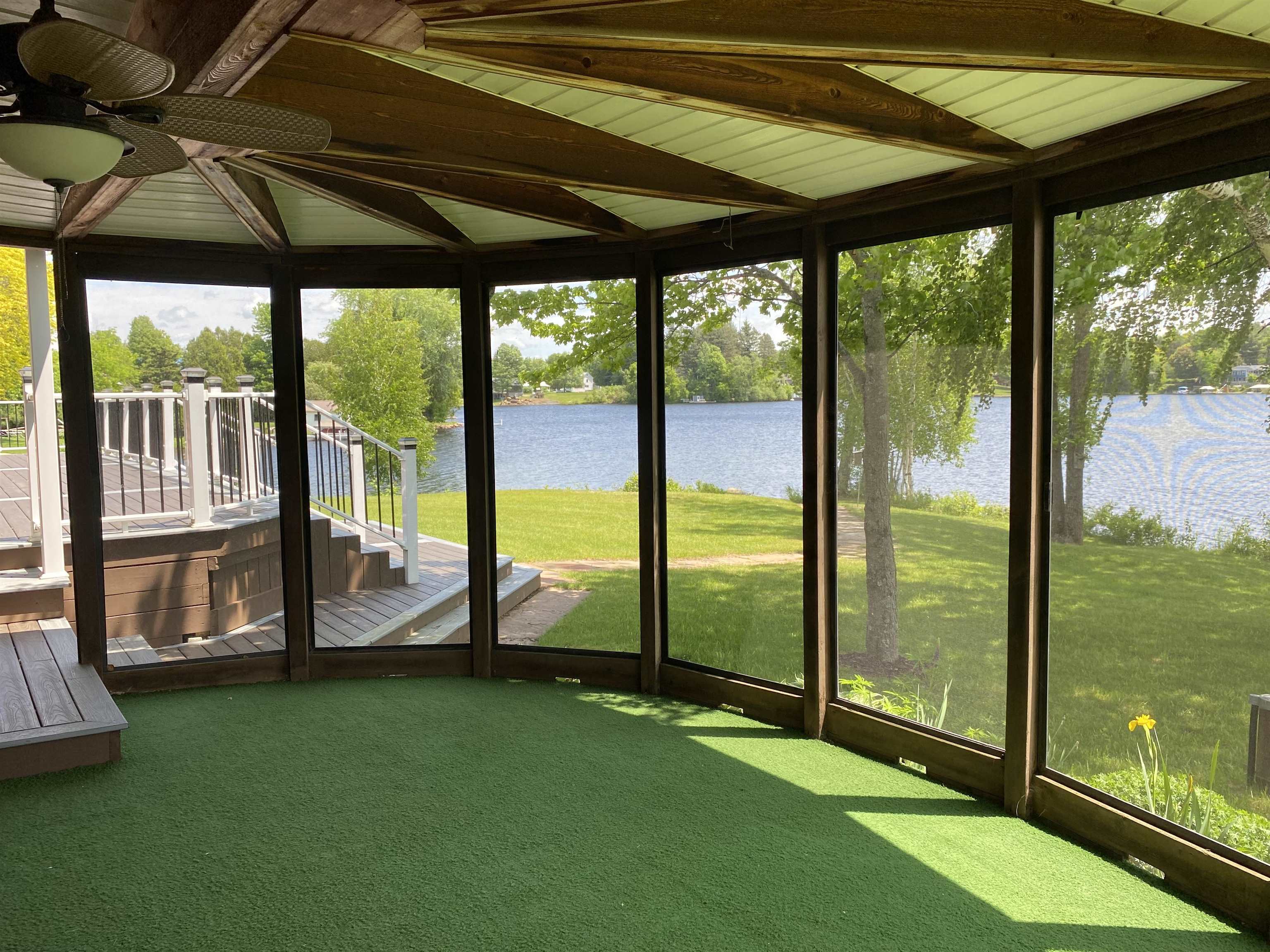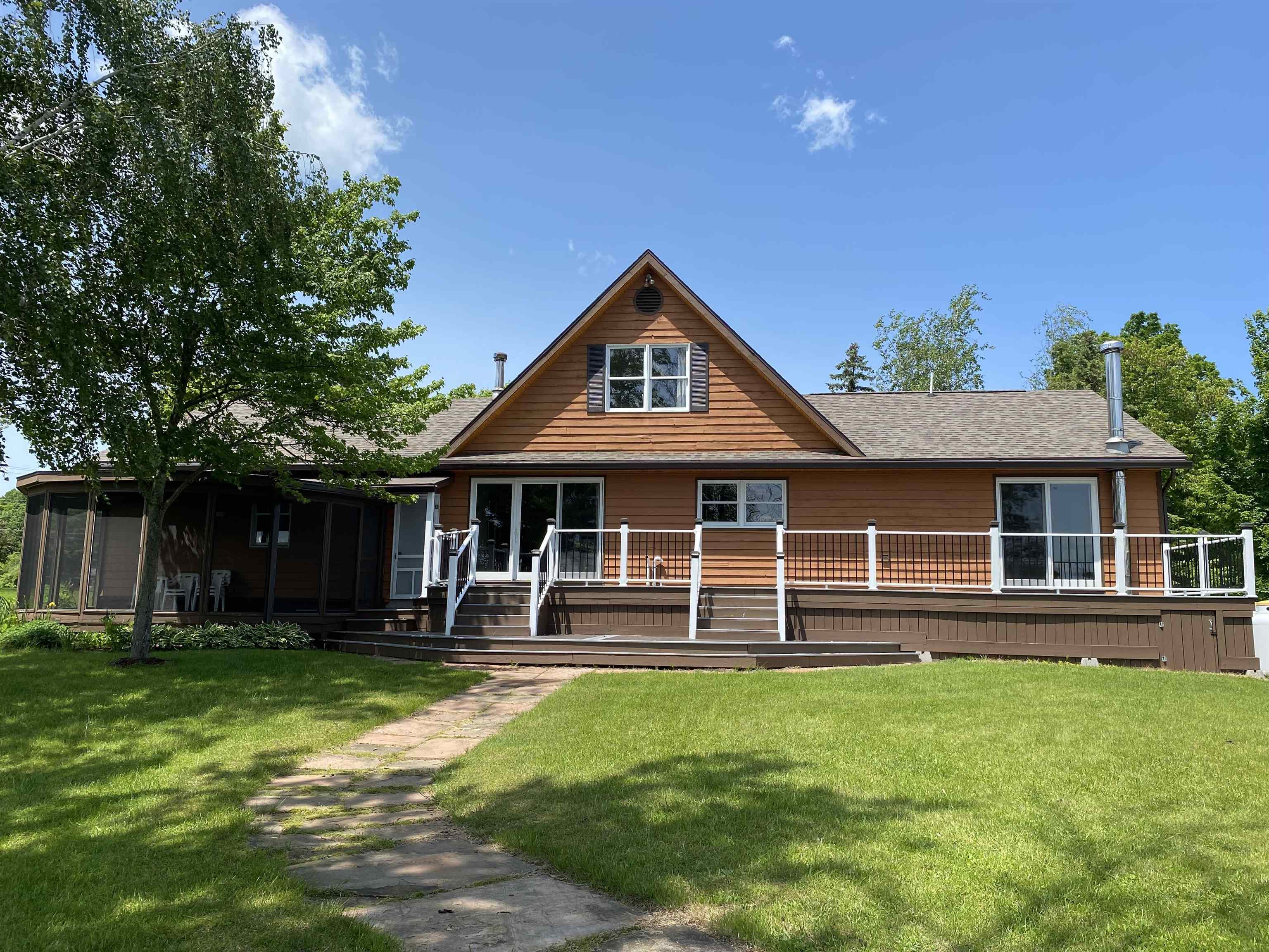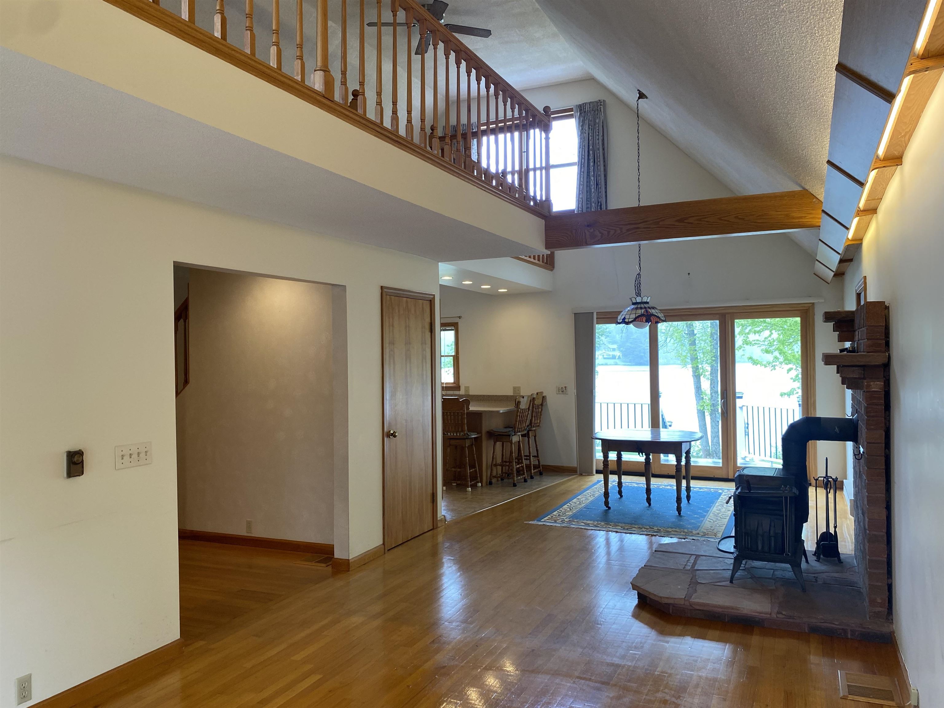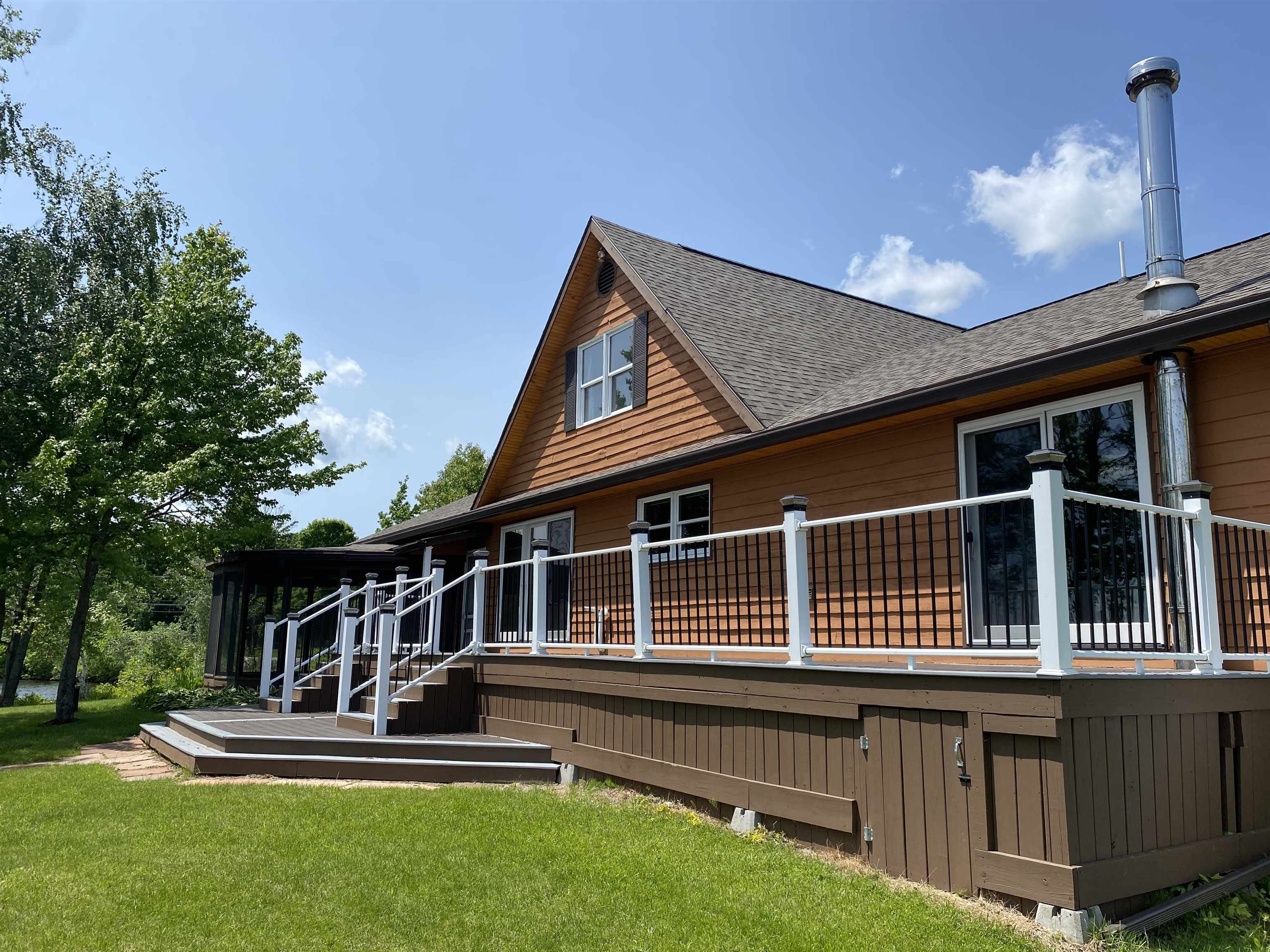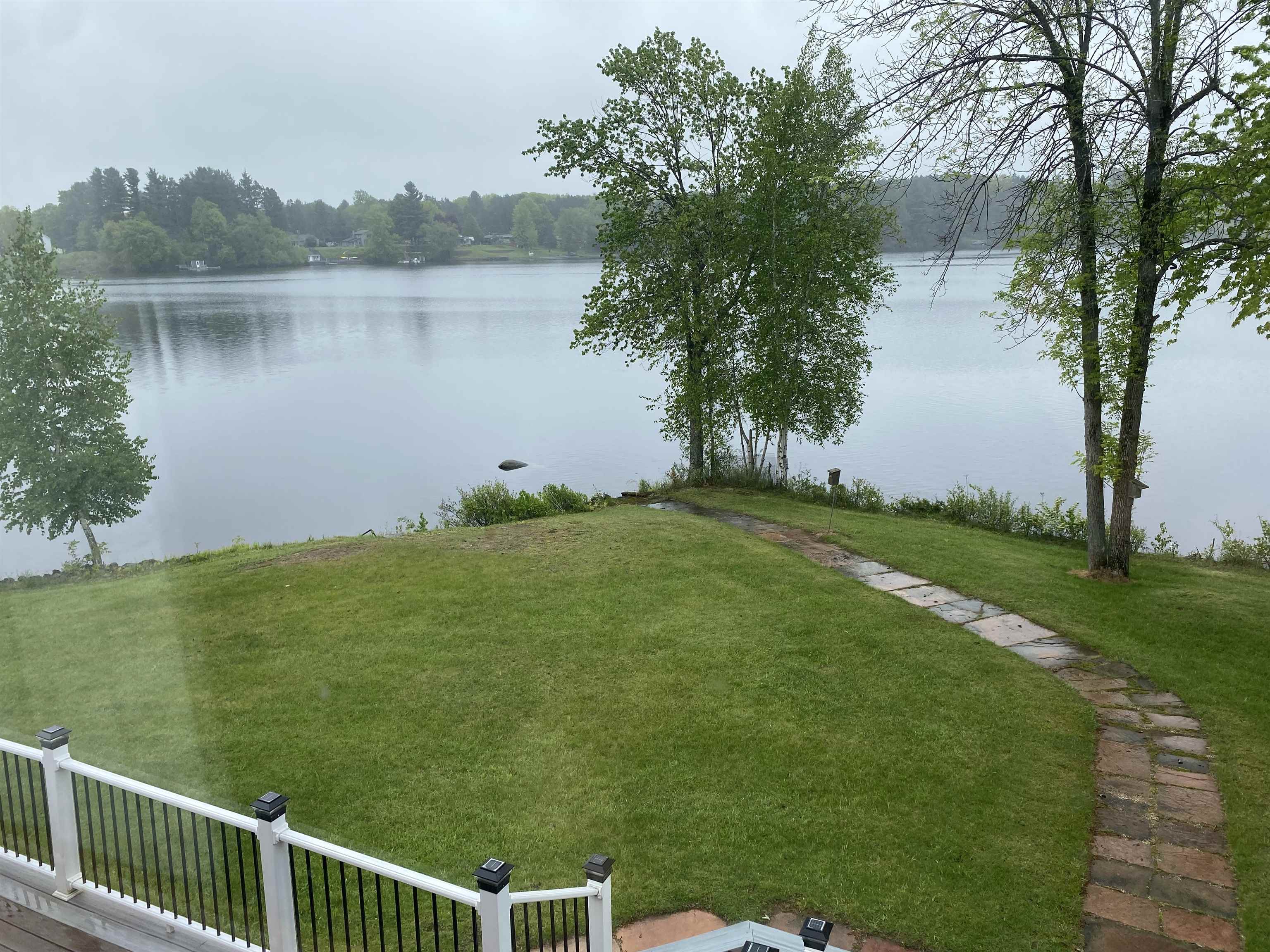 This well-maintained 3-bedroom, 2-bath home offers one of the larger water frontages on Hannawa Pond—approximately 384 feet—and a layout that blends comfort, function, and views. Outside, a new large composite deck and an arced screened porch provide excellent spaces to take in the water and surrounding landscape. A Potsdam sandstone pathway, made from reclaimed downtown sidewalk stone, leads from the deck to the shoreline. The paved wraparound driveway offers ample parking and will be sealed when weather allows. The exterior was also repainted and re-stained last year. Inside, the open-concept kitchen, living, and dining area is vaulted to a second-floor loft and filled with natural light. The updated kitchen includes stone countertops, stainless steel appliances, a breakfast bar, and a sink with a view of the pond. A newer sliding glass door connects the living space to the back deck. There’s also a wood-burning fireplace in the main living area for extra warmth and atmosphere. The loft space includes a great added flexible living space, lots of built-in storage and even a catwalk to a window that overlooks the water. A door off the dining area leads to an attached two-car insulated garage that includes automatic openers and a second stairwell to the lower level—ideal for easy access and convenience The primary suite on the main floor includes private deck access, a walk-in shower, and in-bathroom laundry. Two additional bedrooms and a full bath with new stone countertop and faucets round out the main level. The finished lower level provides an additional ~845 sq. ft. of heated living space and adds another flexible living space with a second kitchen area, propane fireplace, large windows, wall-to-wall carpet, and multiple storage options, including a walk-in mechanical room with three walls of built-in shelving. From its historic Potsdam sandstone walkway to the reconfigured deck and meticulously maintained interior and exterior, this home has been lovingly cared for and thoughtfully upgraded. With one of the larger water frontages on Hannawa Pond, this property offers both privacy and endless opportunity to enjoy lakeside living at its finest