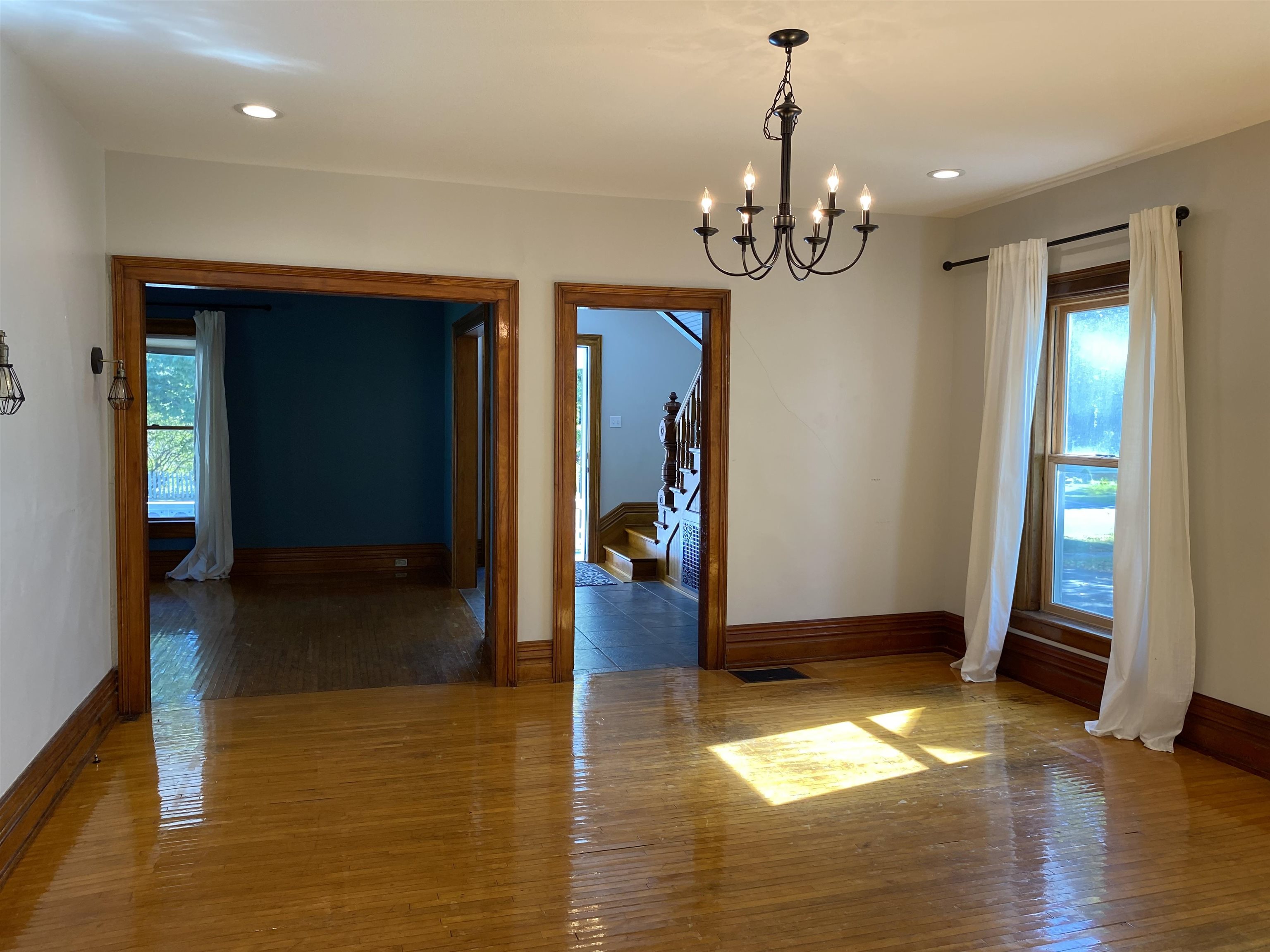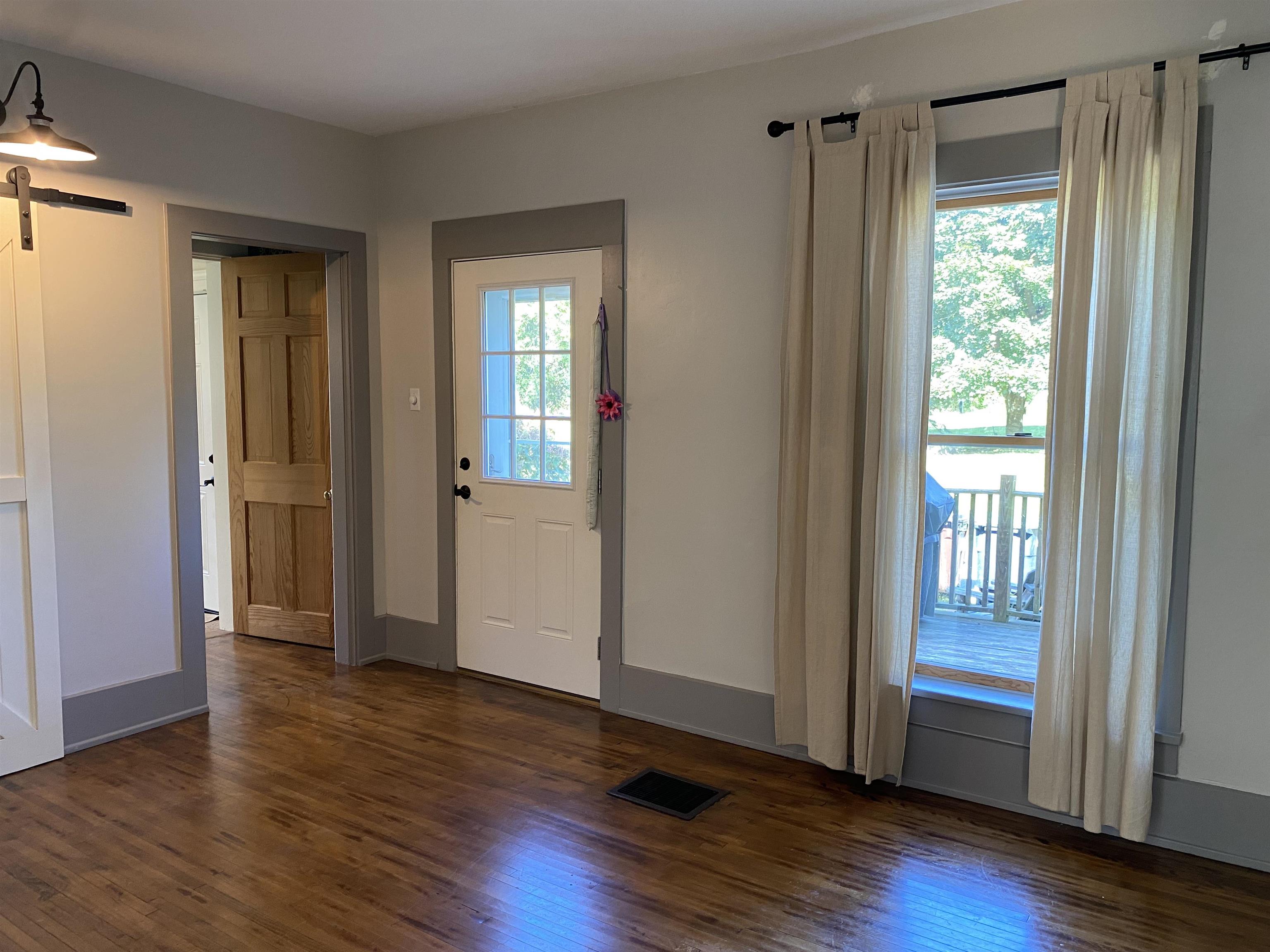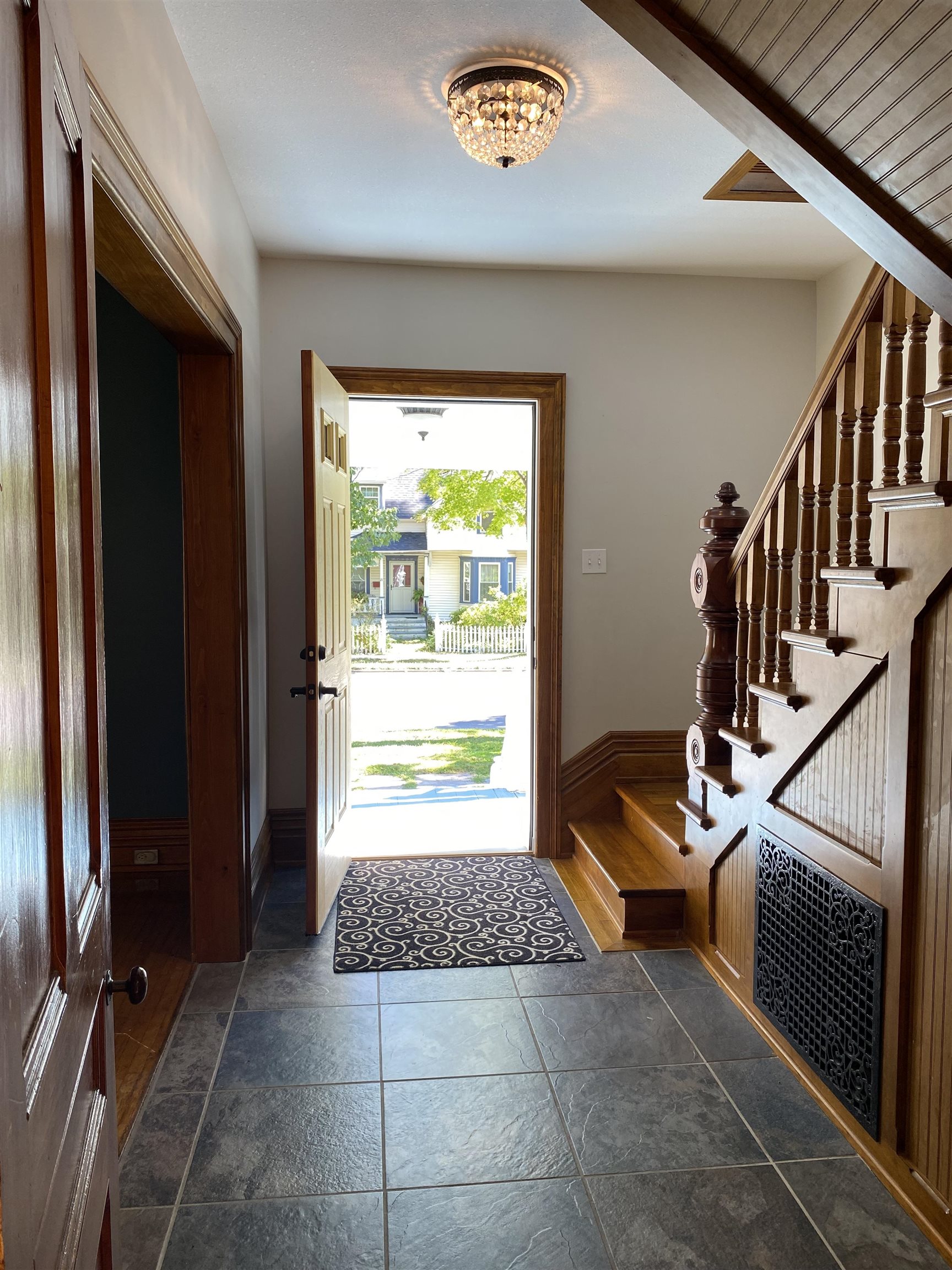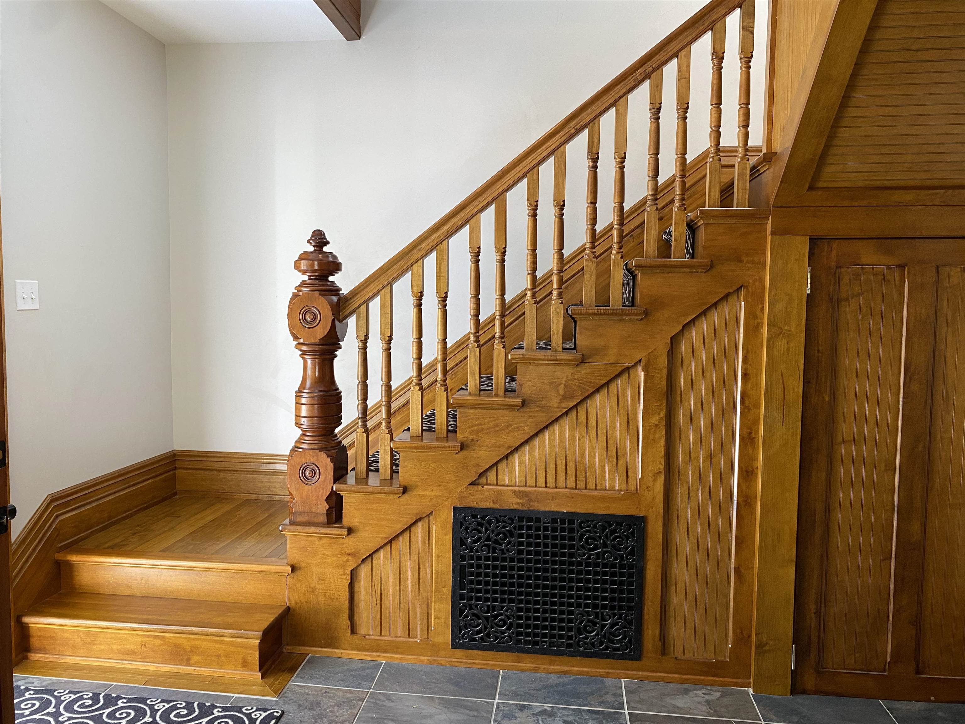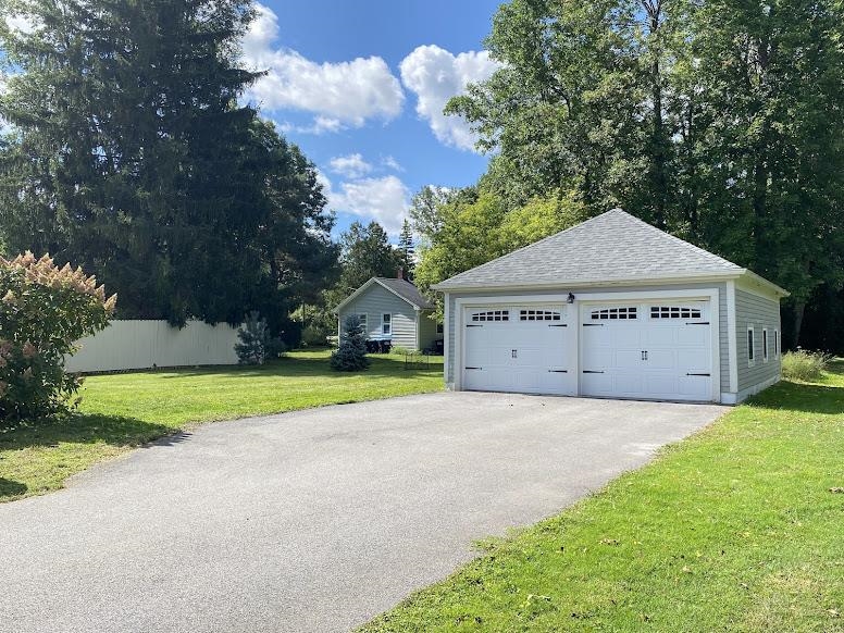 This beautifully remodeled four-bedroom, three-bath home in the Village of Potsdam blends timeless charm with thoughtful modern updates. Set on a lovely lot with a wrap-around porch, side deck, patio, and a landscaped yard designed by Willow Tree Landscaping, this traditional three-story residence offers both curb appeal and comfortable living. The detached two-car garage with automatic doors and a backyard accented by recently planted trees add to the appeal. Step inside the welcoming foyer, where a detailed wood staircase sets the tone for the home’s character. The foyer opens to a large dining room and a spacious living room, both featuring hardwood floors, oversized windows, and updated light fixtures. Just off the dining room, you’ll find a versatile room with two built-in bookshelves, a walk-in closet, and a private three-quarter bath—perfect as a bedroom, den, library, or whatever you need! The completely remodeled kitchen is bright and stylish, showcasing white cabinetry, stone countertops, penny tile backsplash, stainless steel appliances, and light tile flooring. It flows into a cozy second dining or flexible space. A sliding barn door opens to a walk-in pantry with wall-to-wall shelving and stacked laundry units. At the back of the home, a sun-filled living area features a built-in daybed with tall bookshelf, a decorative stone fireplace (not currently working), windows overlooking the backyard, and a door to the large side deck. Two staircases lead upstairs, where you’ll find the impressive primary suite. The primary bedroom boasts a custom walk-in closet with crown molding, double hanging bars, drawers, shelving, and a vanity area. The adjoining remodeled bath offers double sinks, custom cabinetry, and a tiled shower. Two additional bedrooms upstairs are equally inviting with the charming wood floors, including one with floor-to-ceiling bookshelves and a custom wardrobe closet. A second renovated full bath is finished with gray tile floors, a clawfoot tub, and stone vanity. The third floor offers a fully finished, open-concept bonus space ideal for recreation, office use, or guest accommodations, complete with a cozy nook featuring cabinetry, a sink, and tile flooring. With its spacious layout, tasteful updates, and blend of character and modern convenience, this Village home is truly one of a kind