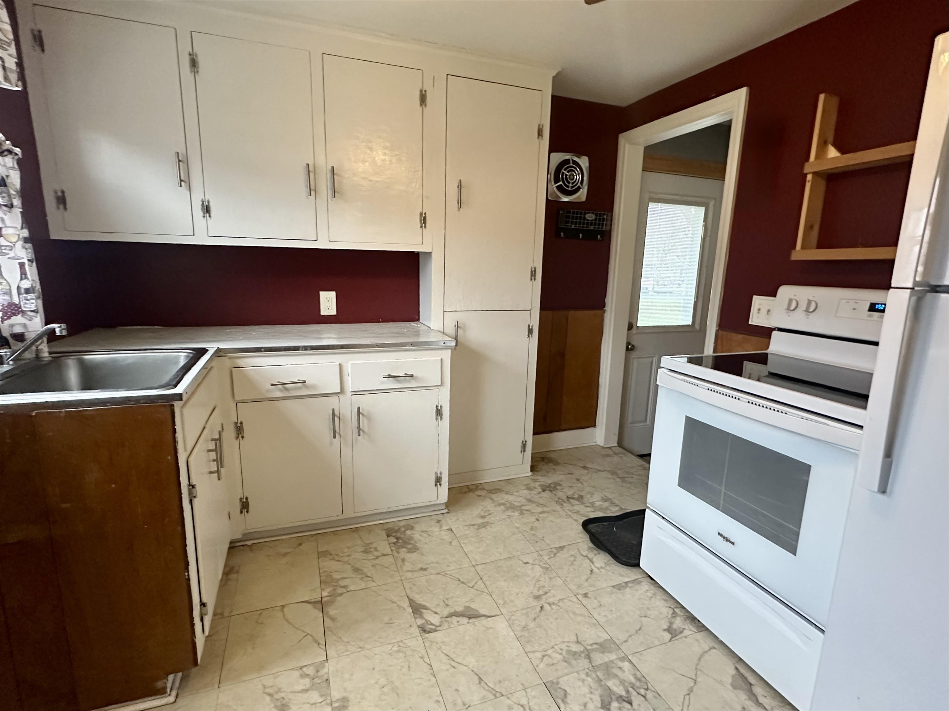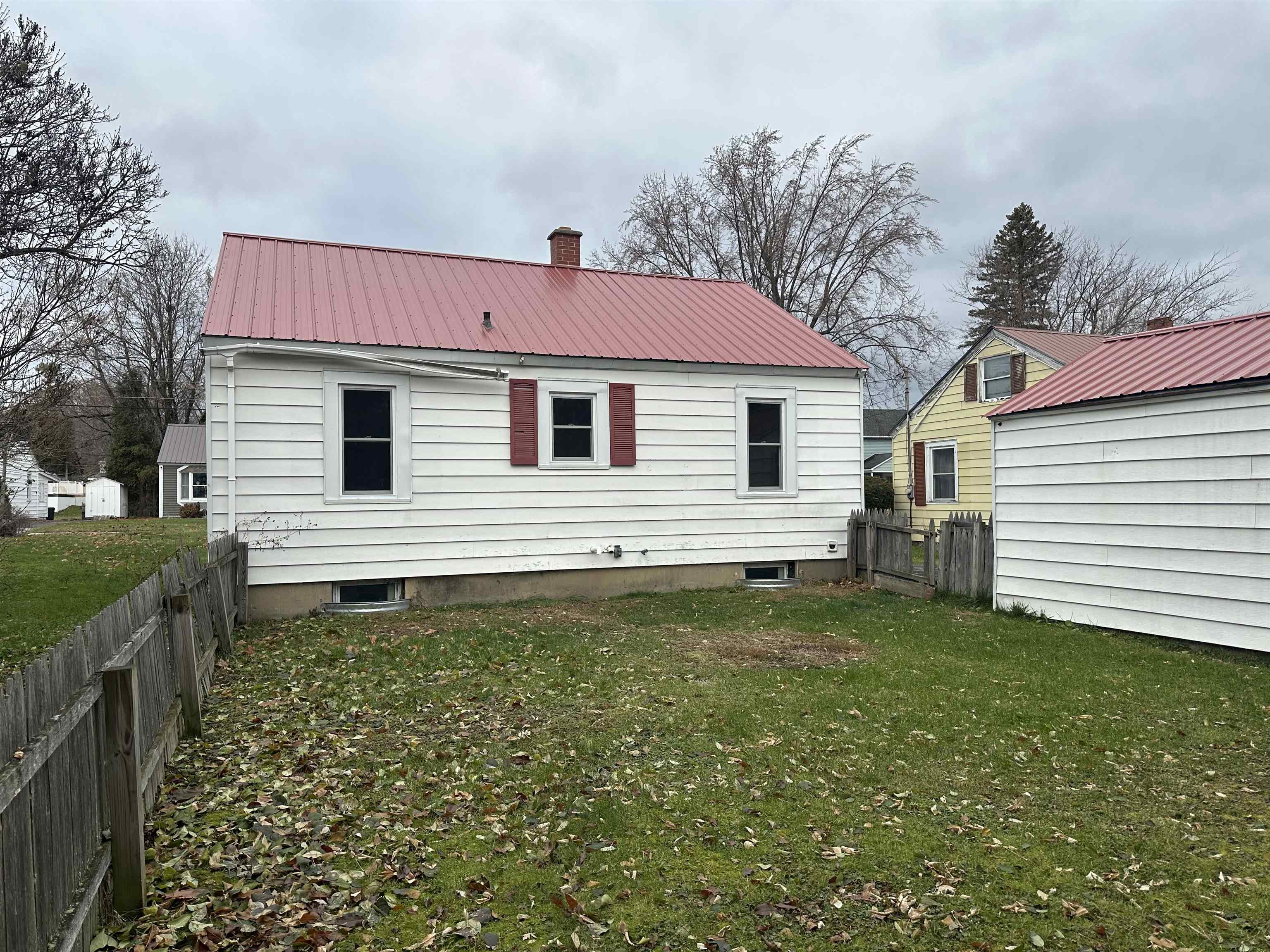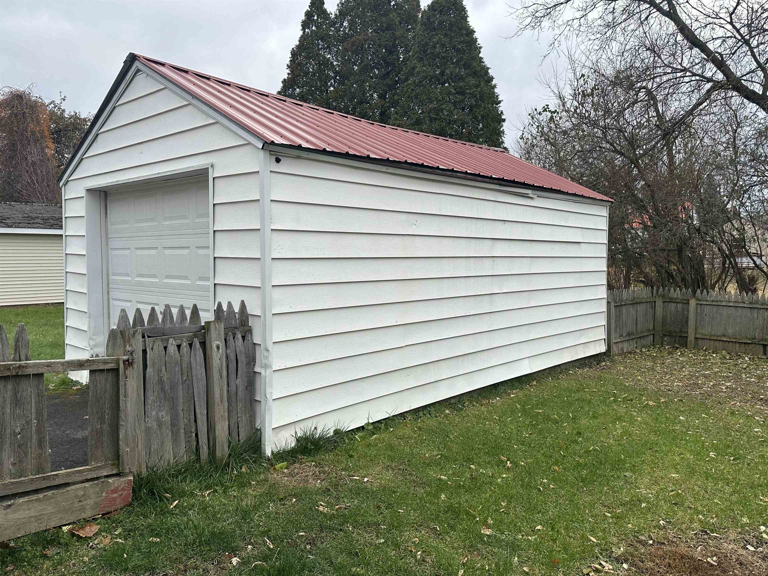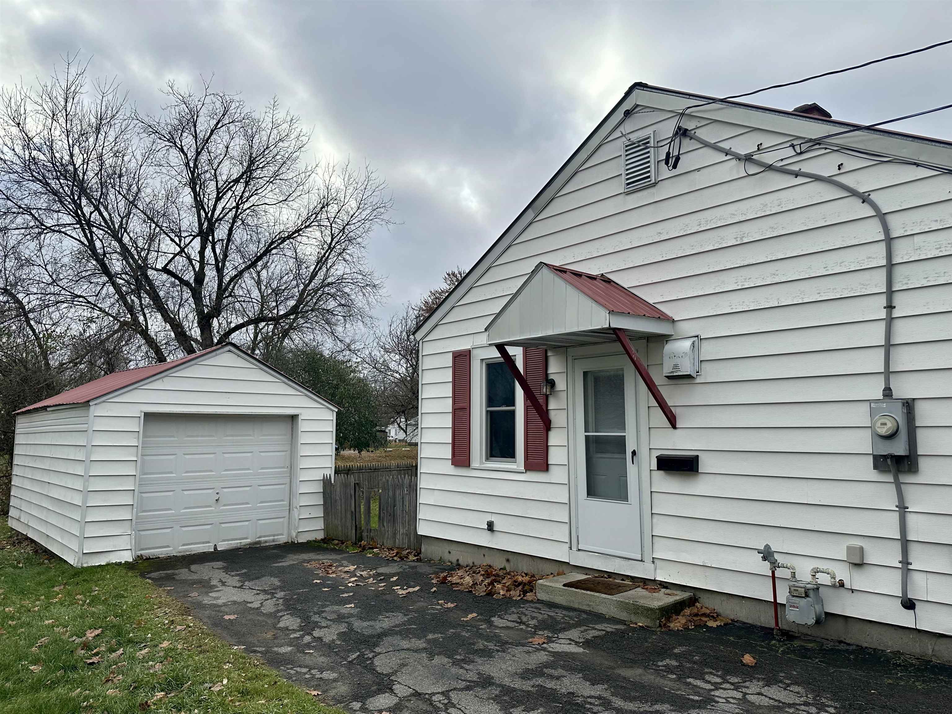 Move-In Ready! This charming 2-bedroom, 1-bath home blends classic character with practical updates. The layout features a nicely-sized family room with coat closet. The cheerful kitchen has a smooth-top electric stove, refrigerator, tile flooring and lots of natural light. It is conveniently laid out to provide space for a small kitchen table and chairs. Both bedrooms have hardwood flooring and closets with 6-panel wood doors. The full bath has a tub/shower and vanity with storage. The full basement offers great storage and includes a washer, dryer, and laundry sink, along with an upgraded 200-amp electrical service. Outside, a detached single-car garage provides extra flexibility. The home has a newer metal roof and the yard is great for pets, gardening, or outdoor living.