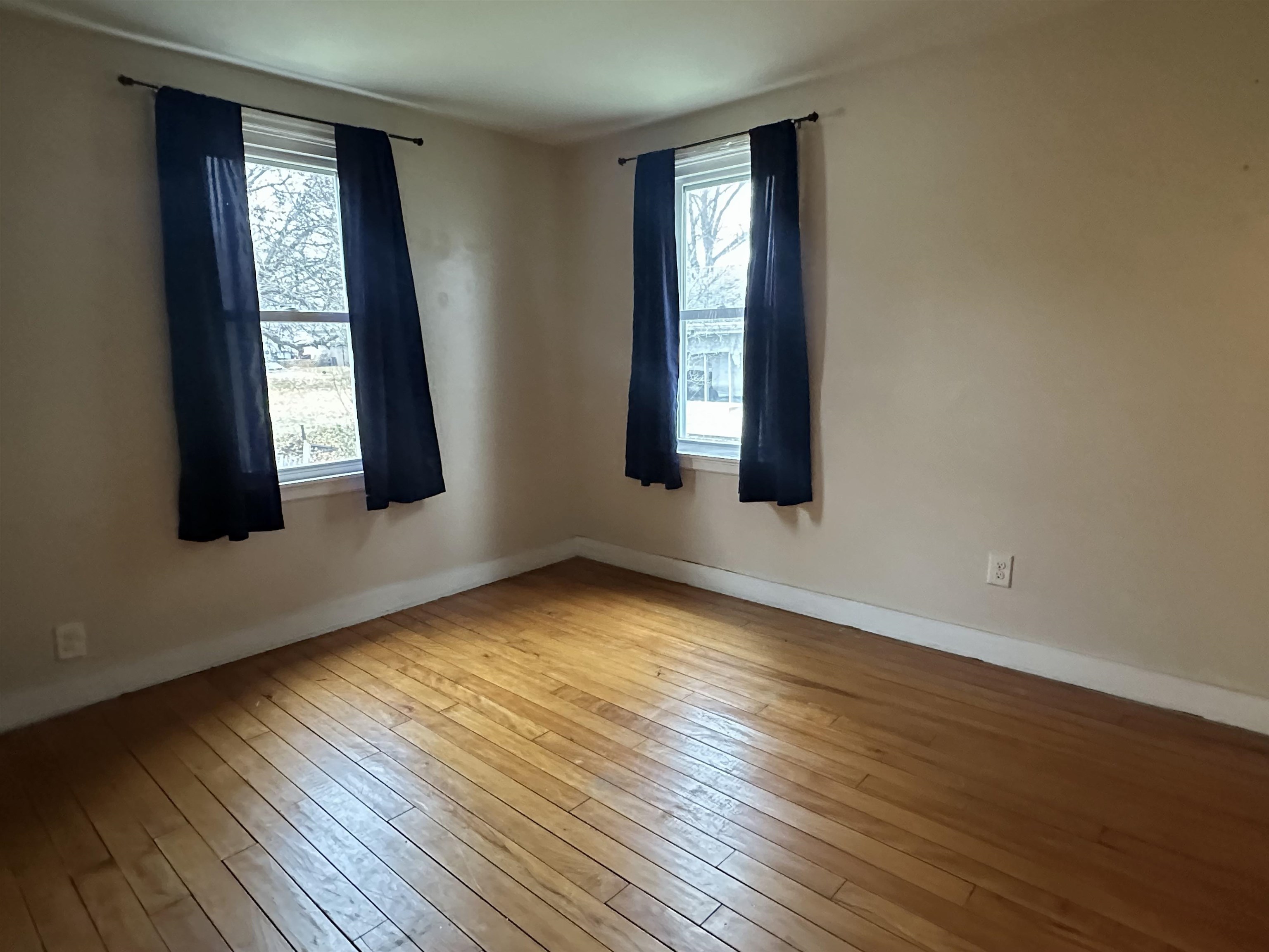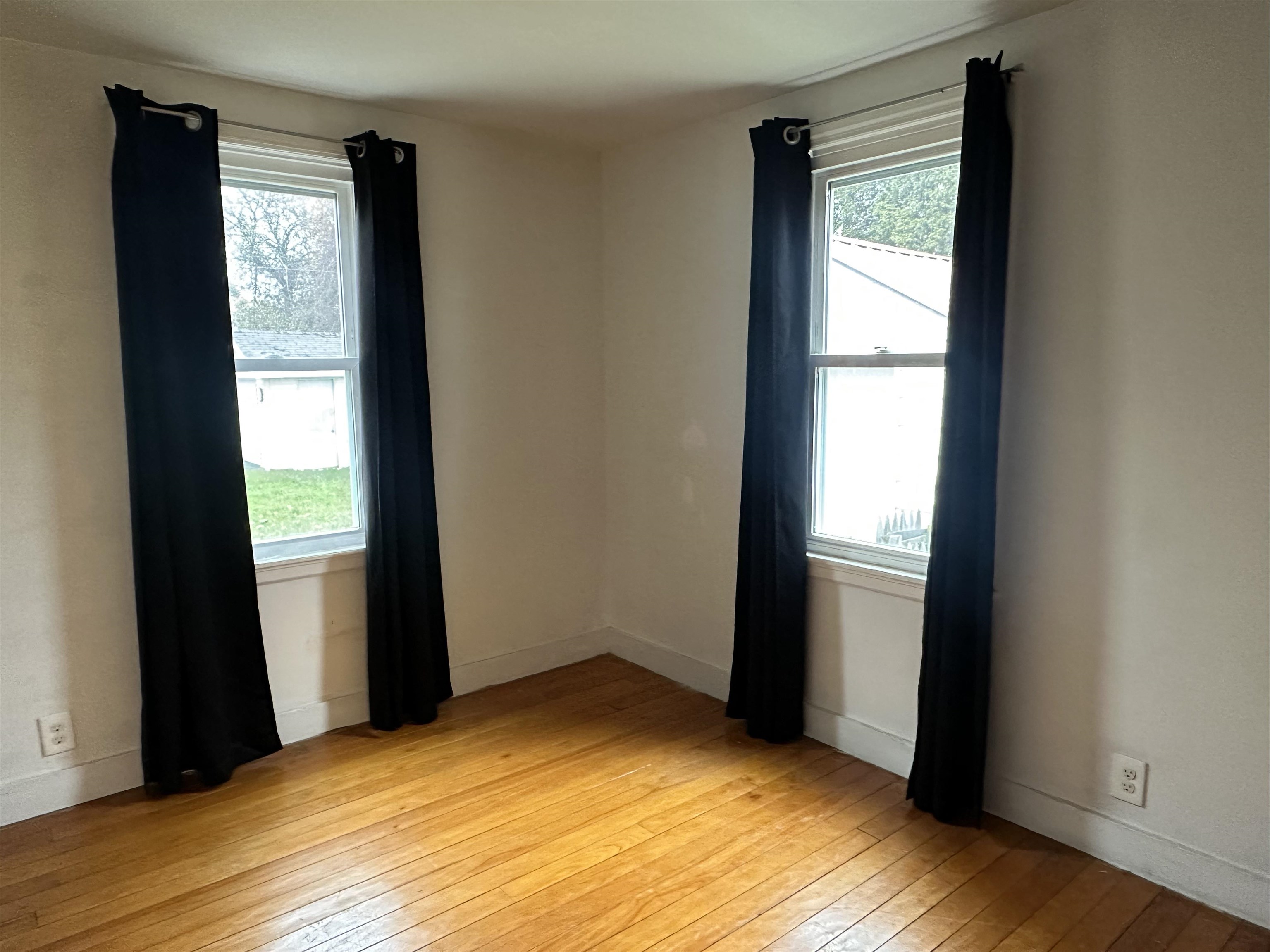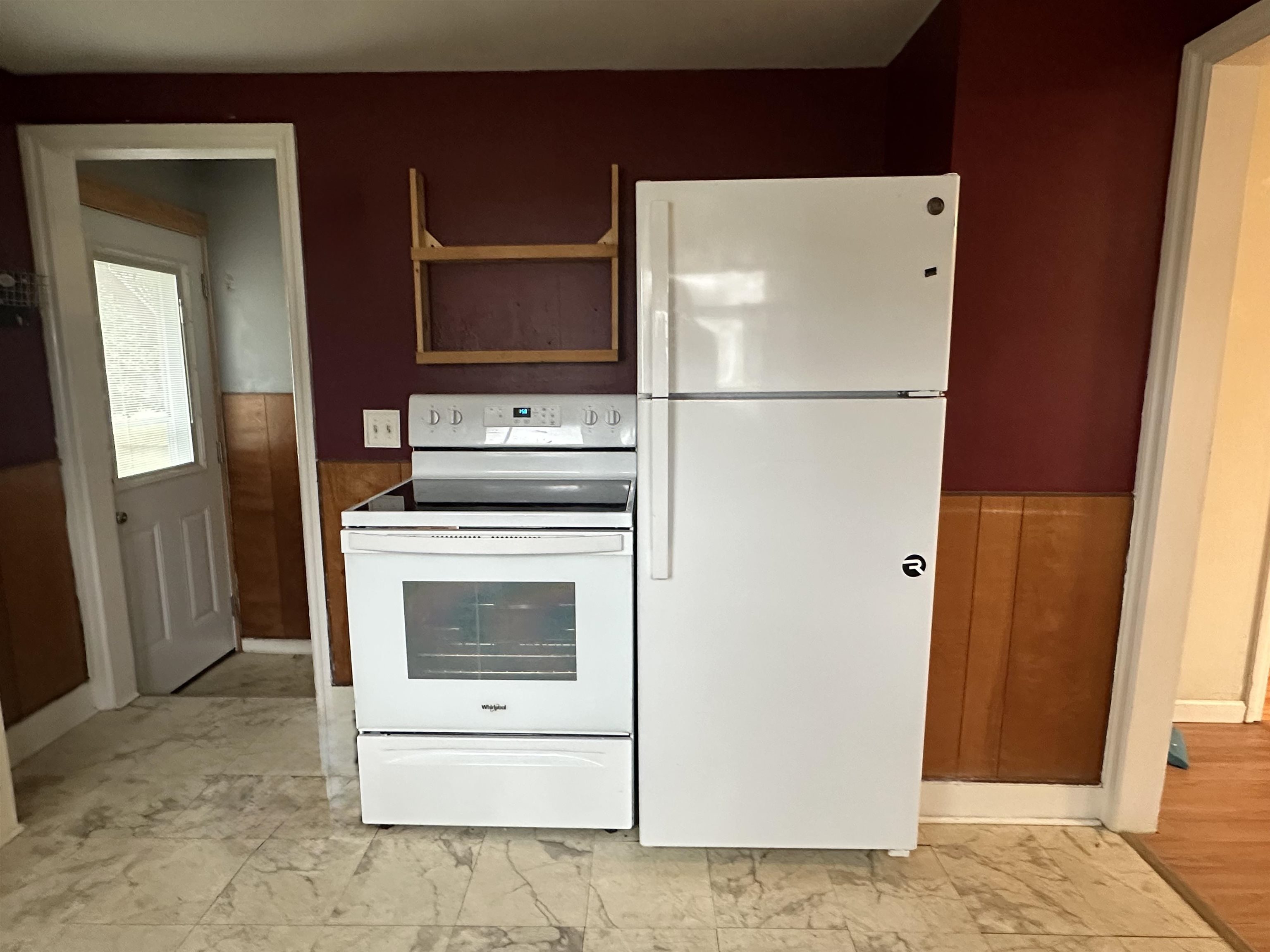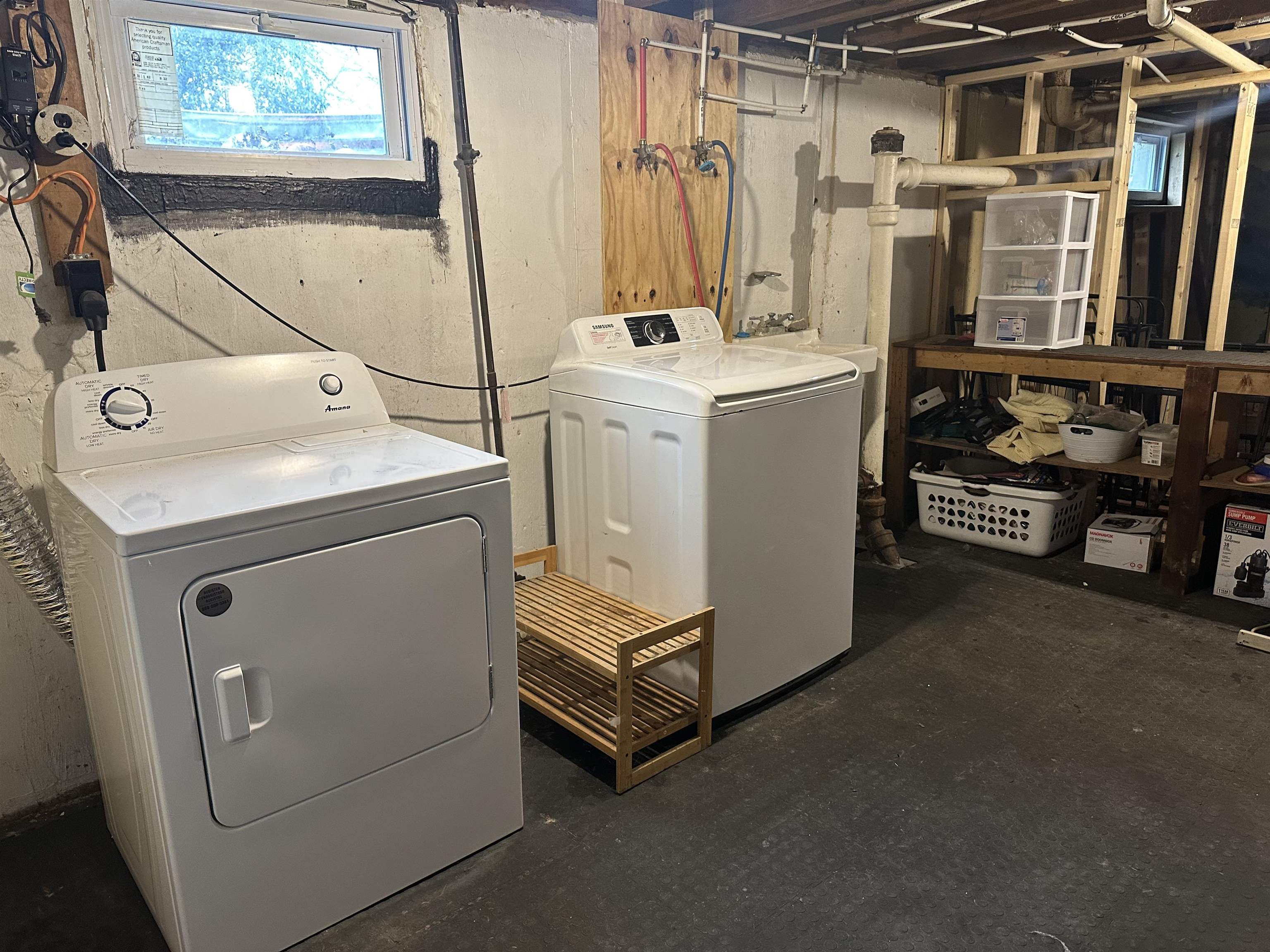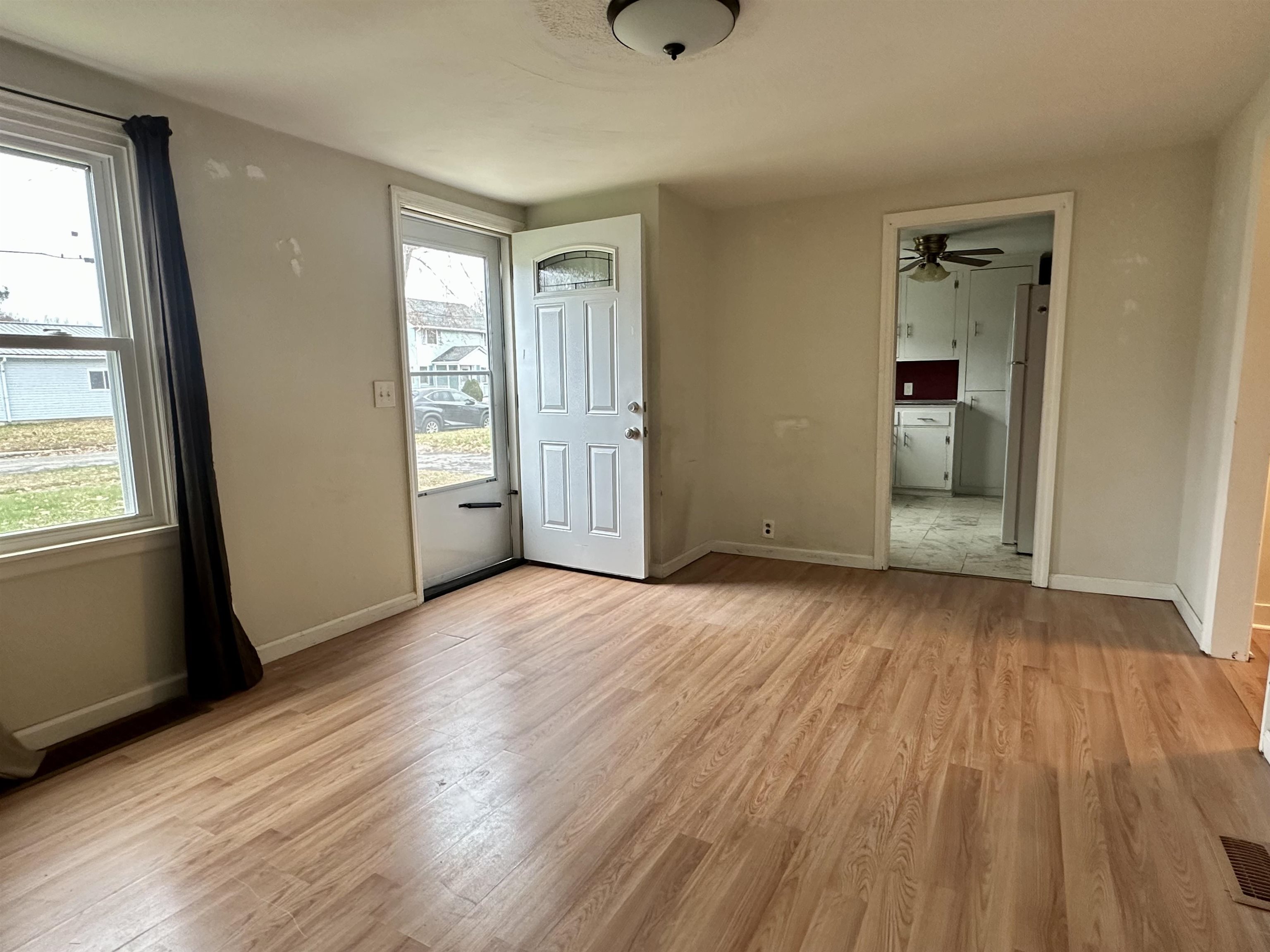 Move-In Ready! This charming 2-bedroom, 1-bath home blends classic character with practical updates. The layout features a nicely-sized family room with coat closet. The cheerful kitchen has a smooth-top electric stove, refrigerator, tile flooring and lots of natural light. It is conveniently laid out to provide space for a small kitchen table and chairs. Both bedrooms have hardwood flooring and closets with 6-panel wood doors. The full bath has a tub/shower and vanity with storage. The full basement offers great storage and includes a washer, dryer, and laundry sink, along with an upgraded 200-amp electrical service. Outside, a detached single-car garage provides extra flexibility. The home has a newer metal roof and the yard is great for pets, gardening, or outdoor living.