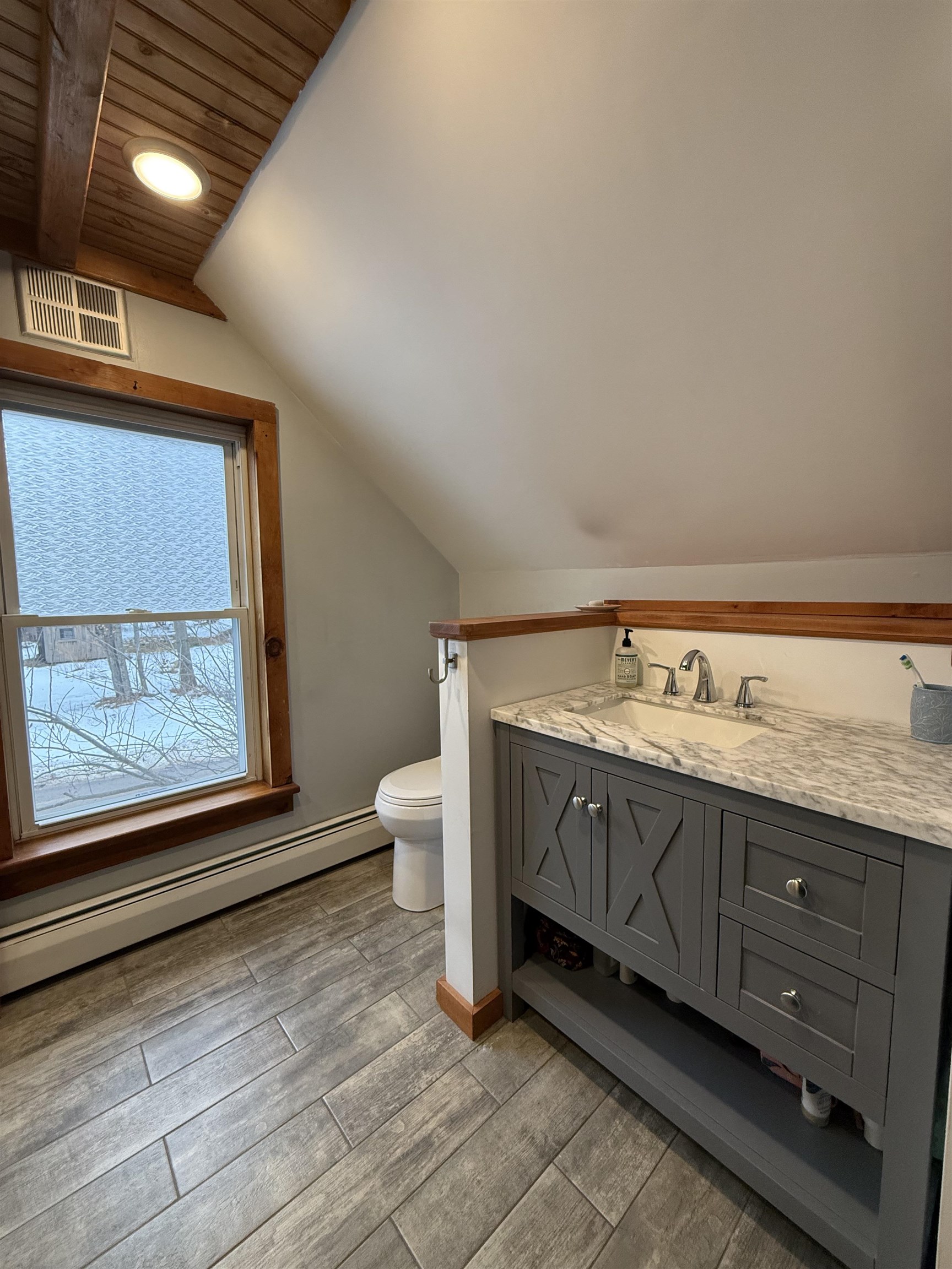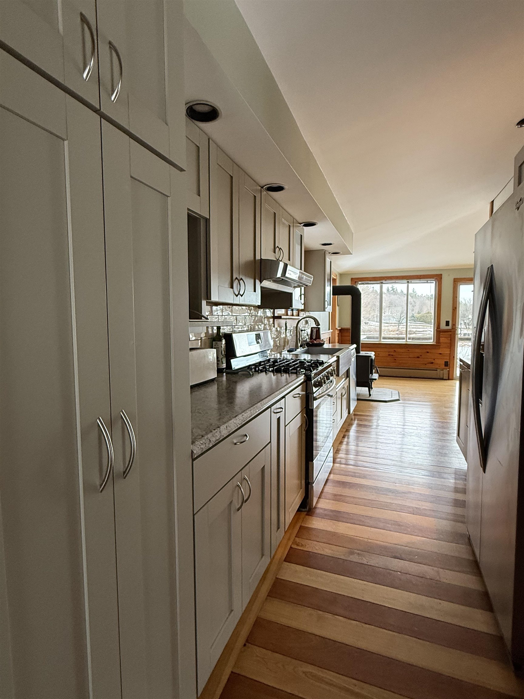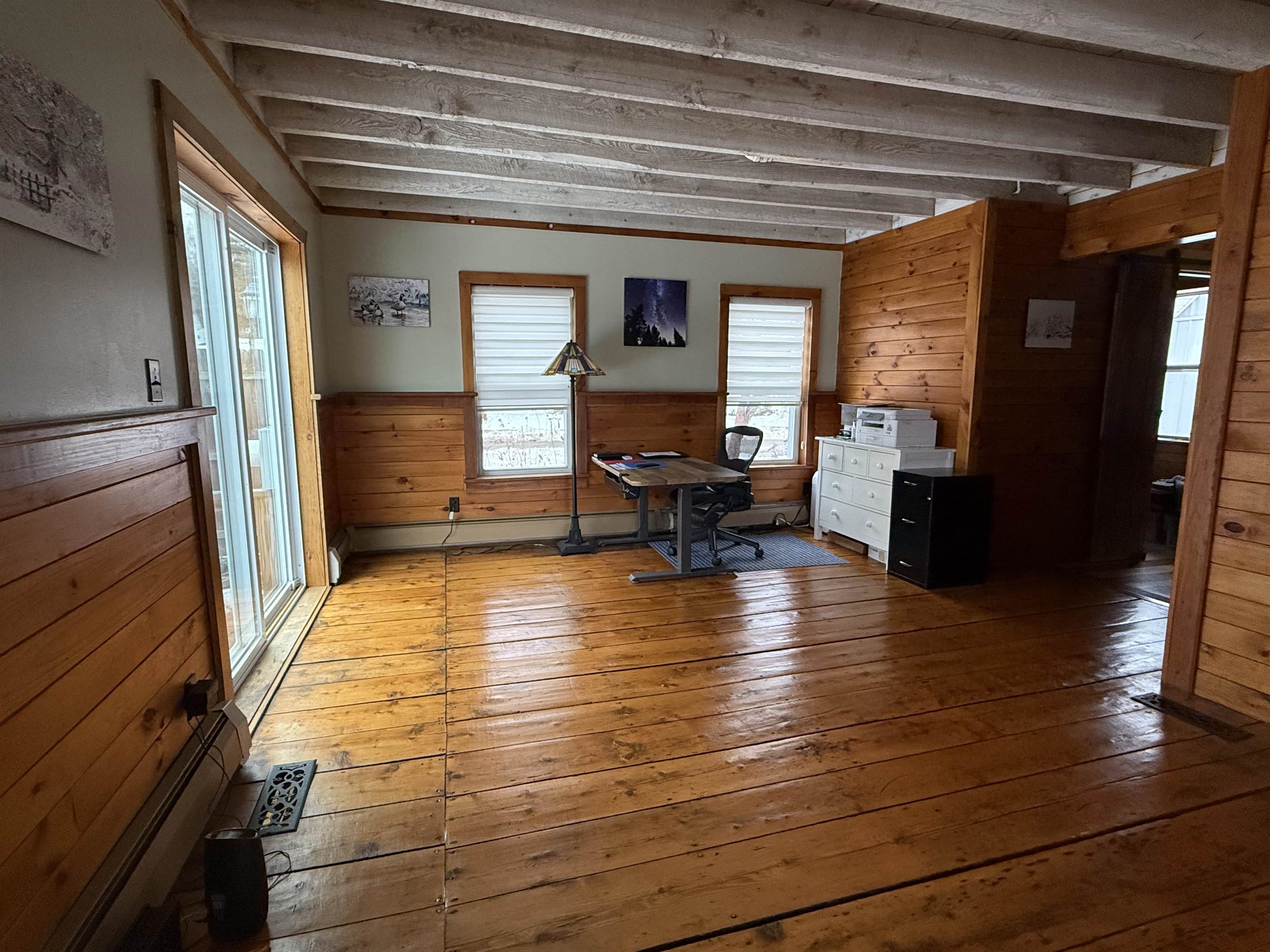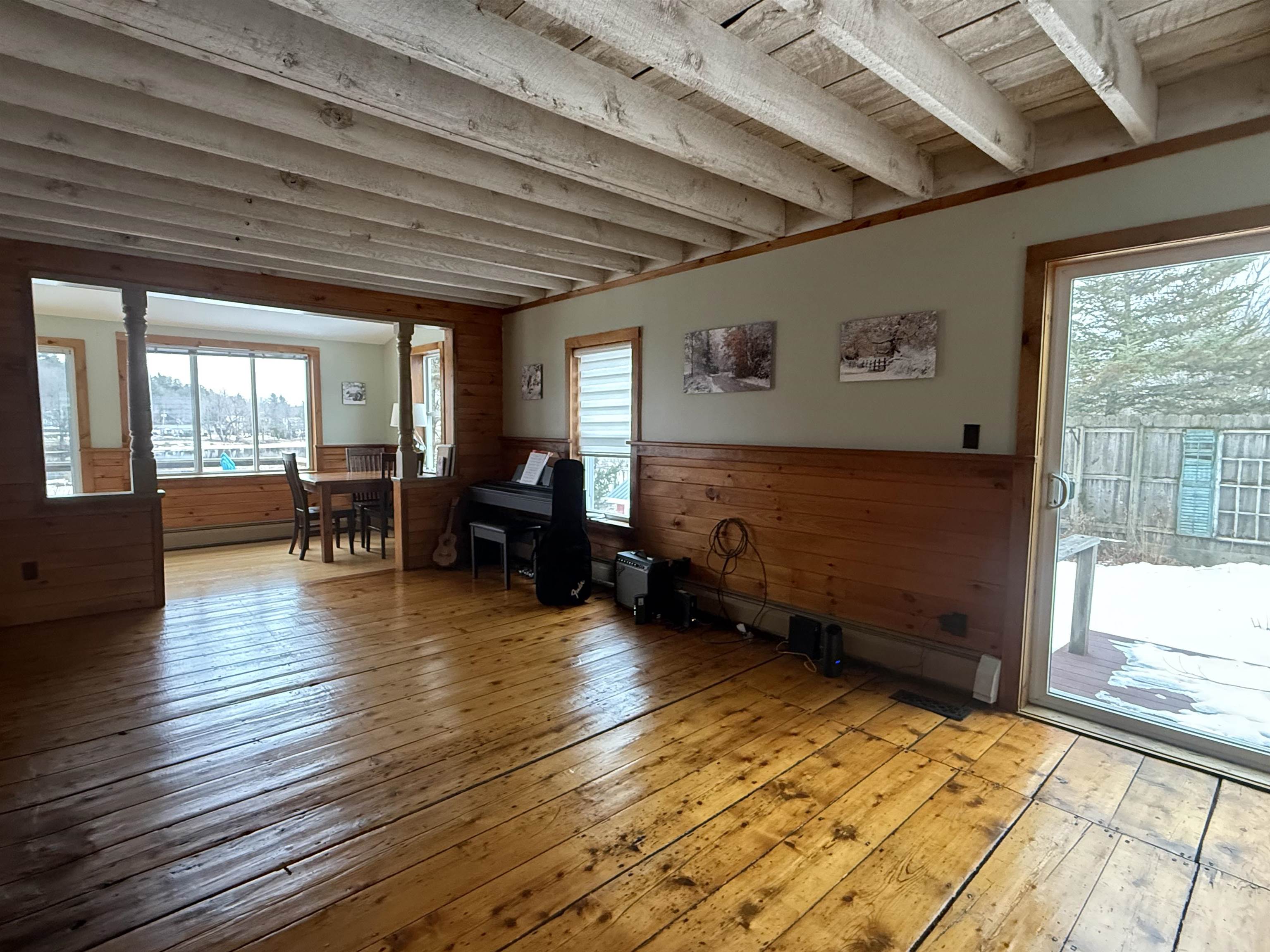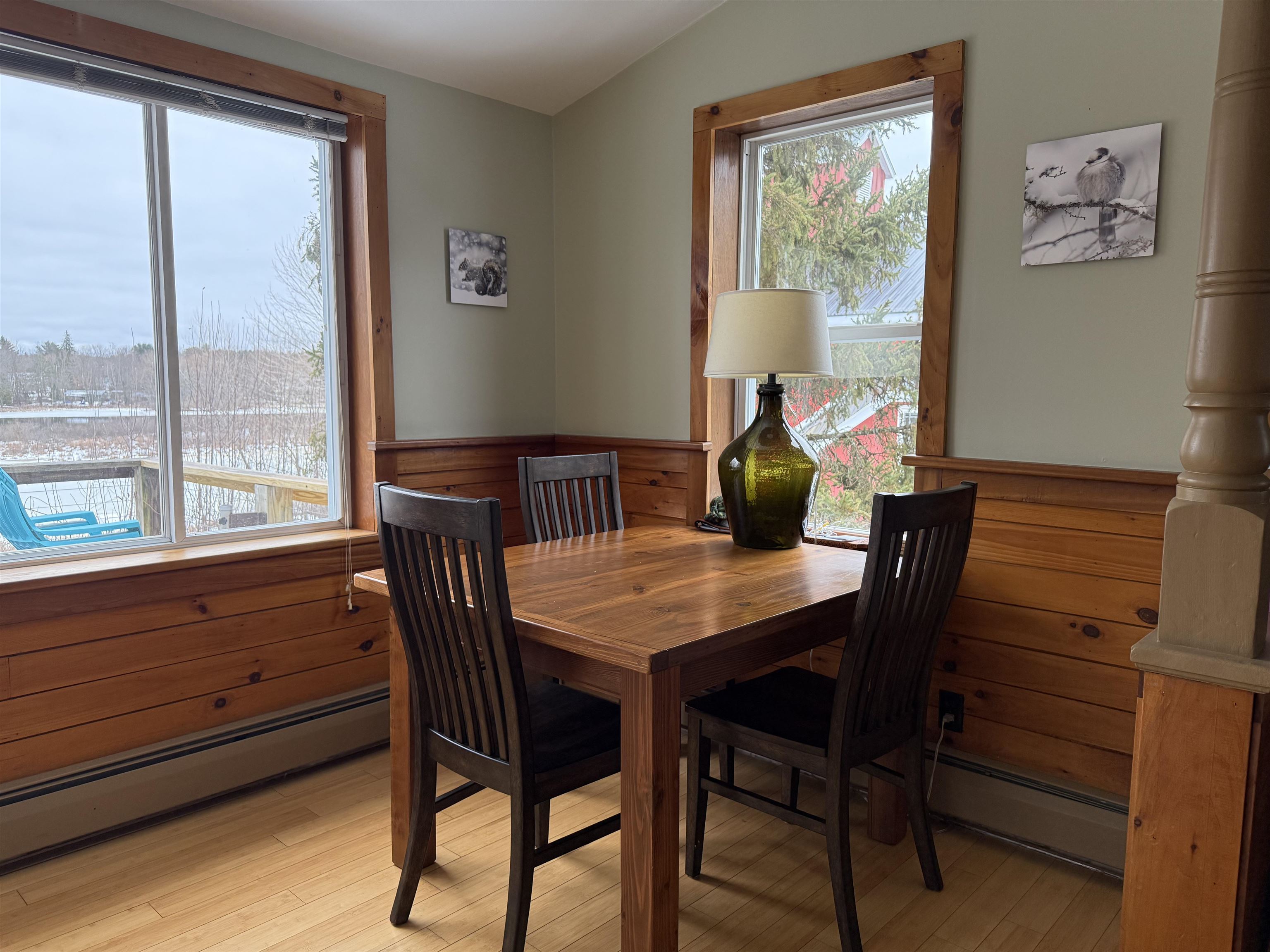 This beautifully renovated circa 1867 home offers a perfect blend of historic charm and modern amenities. The galley kitchen has all the amenities and is open to an informal dining and sitting area featuring cherry and maple floors with a cozy wood stove creating a warm and inviting atmosphere. The French doors lead out to a spacious deck overlooking 87 feet of water frontage on the Raquette River. The living room has tongue and groove pine walls and an open ceiling offering a cottage style design. This space boasts wood pegged flooring that flows seamlessly into the dining area with sliding glass doors to a bi-level deck, perfect for outdoor living and entertaining. Upstairs, the ensuite primary bedroom boasts a Palladian window with water views, a walk-in closet, a dressing area, and a luxurious walk-in tiled shower. The walk-out basement includes a second bedroom or den, a full bath, a mechanical room/workshop, and a laundry area. Outdoor living spaces abound, with a bi-level deck, patios, and a beautifully landscaped yard offering panoramic and serene river views. Additional features include: in-floor radiant heat in the entryway and bathrooms, a detached two-car garage, and barn-style potting shed/storage. This charming and unique property is a rare find for those seeking historic character, modern comfort, and breathtaking waterfront views. Here...you have it all!! Your waterfront retreat awaits!!