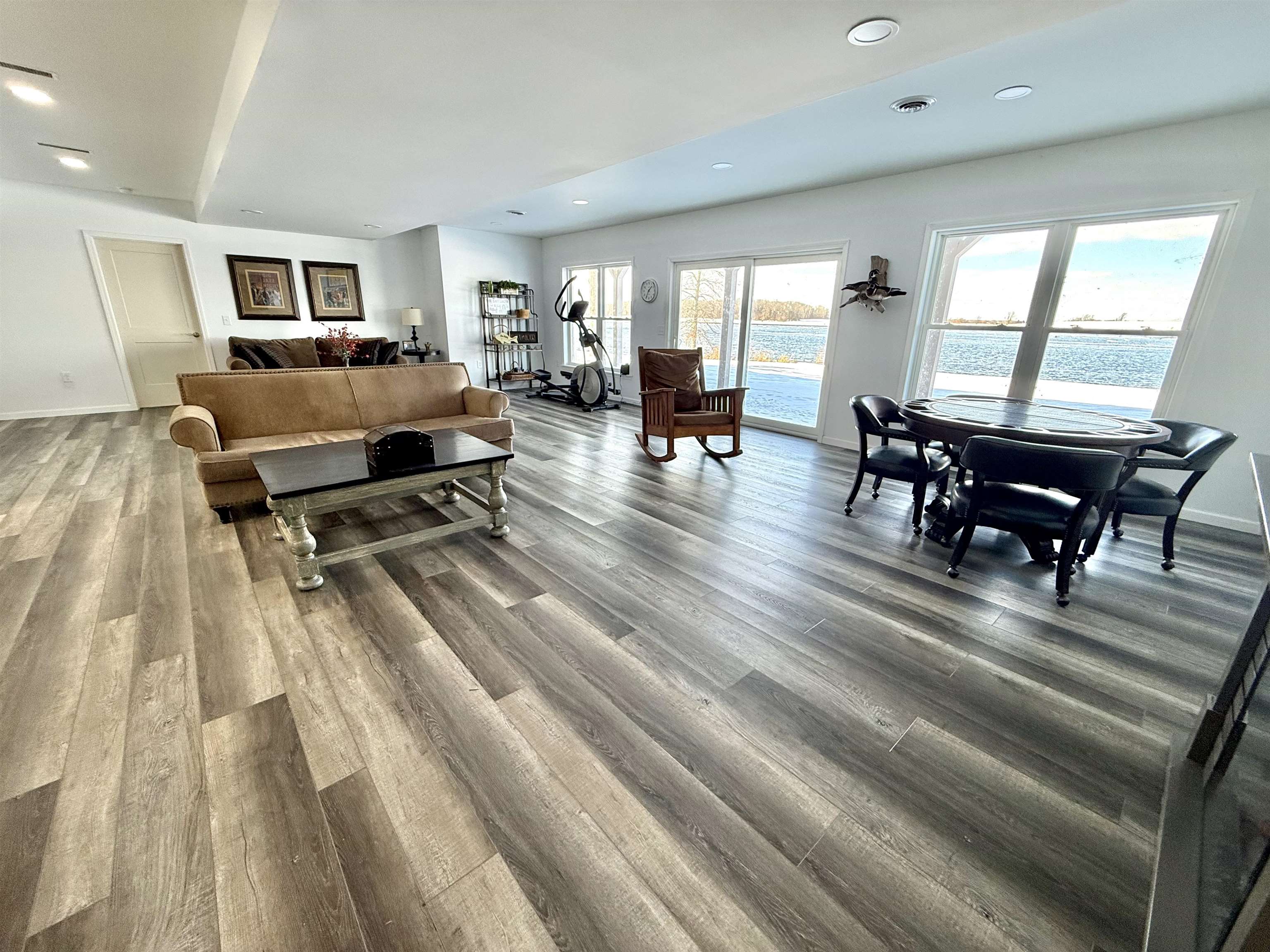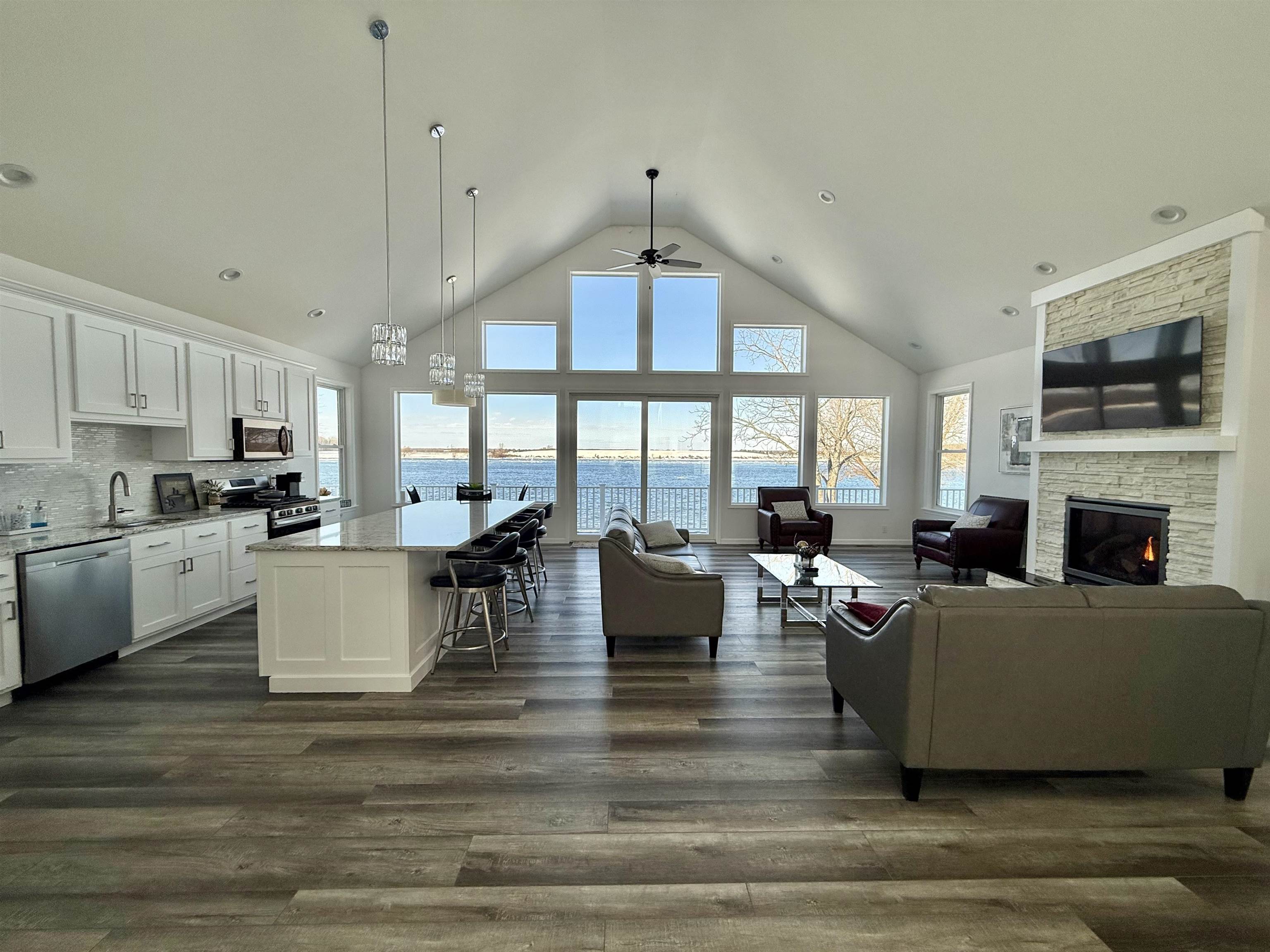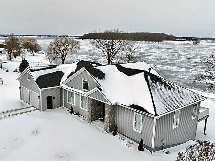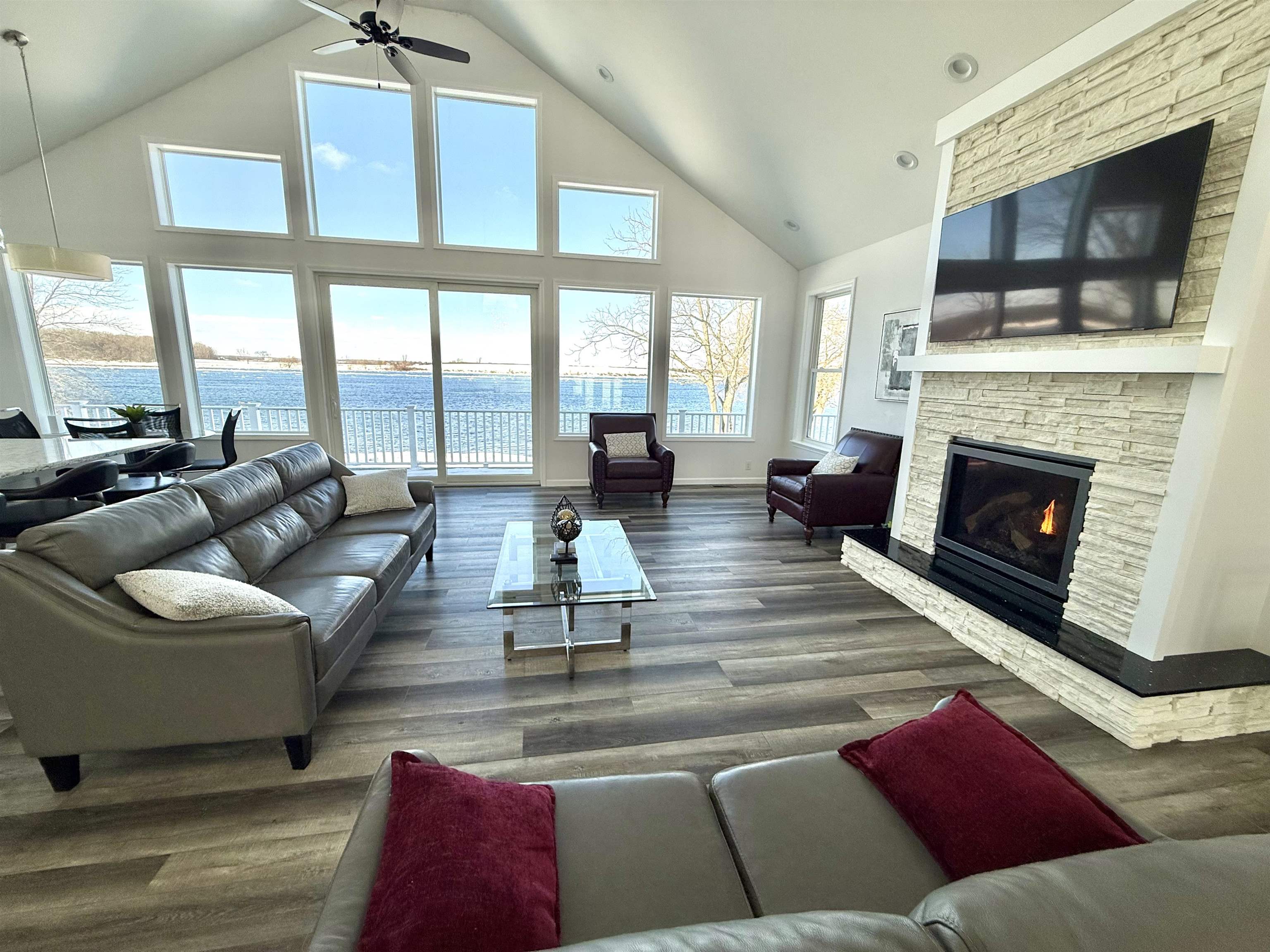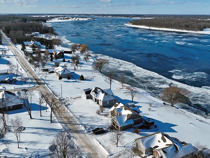 Rare Opportunity– Embrace year-round waterfront living in this exquisite custom-built residence perched along 120 feet of level St. Lawrence River shoreline, in the highly sought-after village of Waddington. Built in 2021, offering 4,300 square feet of quality craftsmanship and thoughtfully designed living space - blending sophistication with comfort, privacy, and timeless style. Step inside through impressive solid wood 10-foot glass doors into an open foyer, setting the tone for refined waterfront living. Here, the open concept layout seamlessly connects the kitchen, dining, and living areas beneath soaring 20-foot cathedral ceilings and expansive floor-to-ceiling windows, framing the breathtaking river views and unparalleled sunsets, filling the home with natural light. Featuring a floor-to-ceiling surround and quartz hearth, the fireplace creates a warm, inviting ambiance. Double glass doors open onto the full-length waterside deck—great for entertaining guests or relaxing by the water. The gourmet kitchen features solid quartz countertops, a spacious island, abundant cabinetry, premium stainless-steel appliances, and a walk-in pantry—perfect for meal preparation and socializing. To the right of the main living area is the primary wing—a private retreat with dual walk-in closets and a spa-inspired en-suite bathroom, complete with a quartz double vanity, and a double-headed shower. Sliding glass doors through the primary bedroom offer direct access to the waterside deck. On the opposite side of the home, two additional bedrooms and a full bath are thoughtfully placed, with each bedroom featuring walk-out glass doors to the deck, ensuring comfort and privacy for family and guests. Completing the main level is a functional mudroom that connects directly to the attached two-car garage, with a conveniently located laundry area. The lower level of the home is designed for both relaxation and productivity. Enjoy a sprawling family and entertainment area with glass doors opening to the stamped concrete waterside patio. One side features a spacious bedroom with river views and a full bathroom, separated by an office nook, while the other side includes an additional bedroom—perfect for guests or hobbies—and an adjacent storage room that can easily serve as a bedroom, both with river views. Additional features include a whole-home generator, central air, water softener, 10-foot interior doors, designer lighting, walk-in closets, recessed lighting, outbuilding for storage, and more. Kitchen appliances and a 30-foot floating dock (with ladder and mooring whips) are included; furnishings and laundry units are negotiable. Located in the charming village of Waddington within walking distance to shops, restaurants, walking trails, and recreational parks with ice skating, pickleball, tennis, and basketball courts, volleyball club, etc. Waddington is famous for hosting the Bassmaster Elite Series, offers world-class carp fishing, and connects to the St. Lawrence snowmobile trail. This home is 20 minutes from the Canadian Bridge to Ottawa, Ogdensburg-Prescott International Airport (with direct flights to DC and Orlando), and Massena International Airport, as well as within an hour of the Adirondack Park and Thousand Islands, and two hours from Lake Placid. Don’t miss this chance to own a remarkable retreat on the St. Lawrence River—schedule your private tour today and experience refined waterfront living.