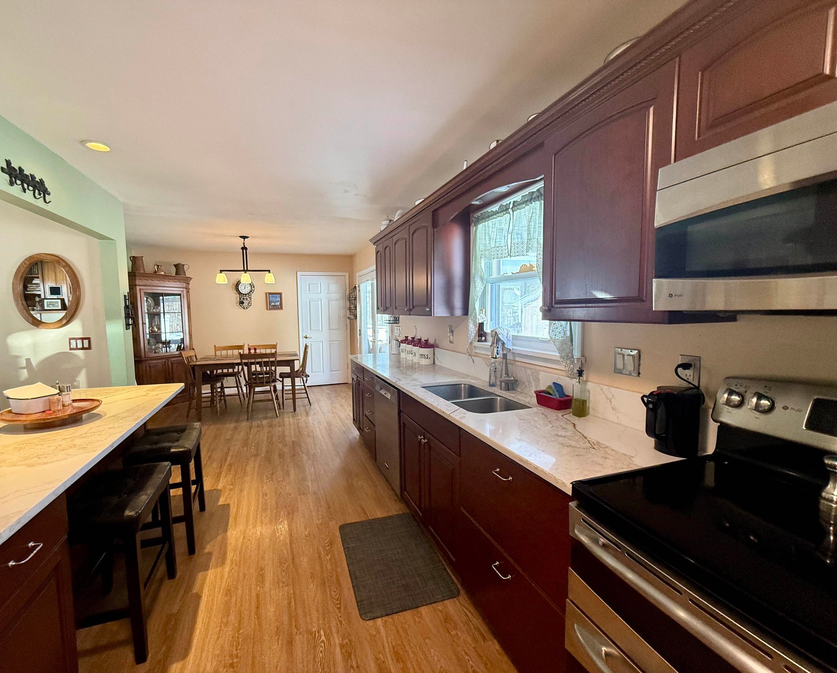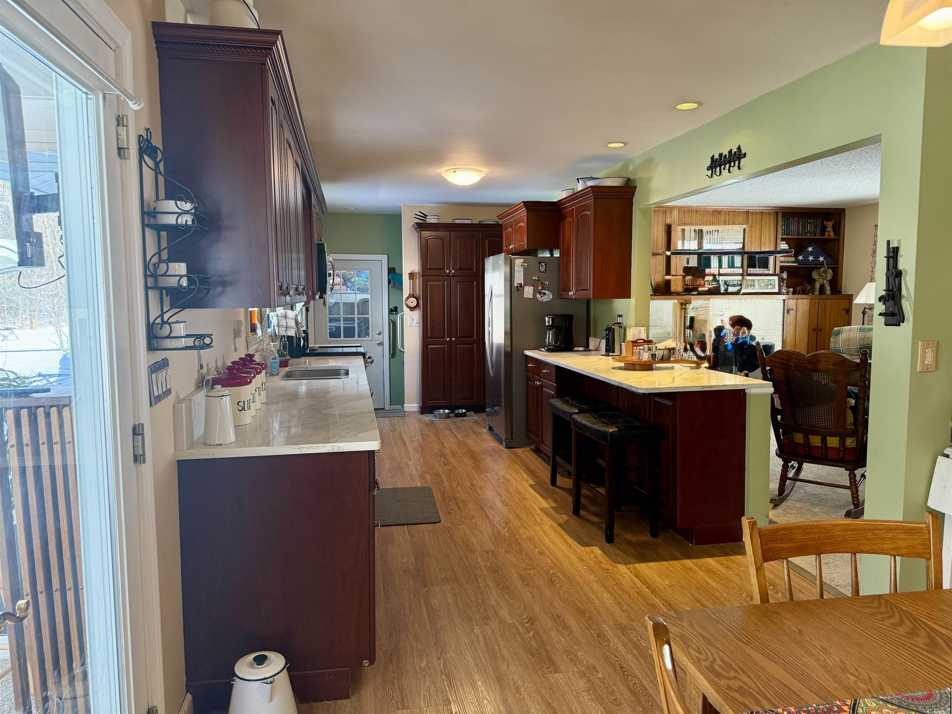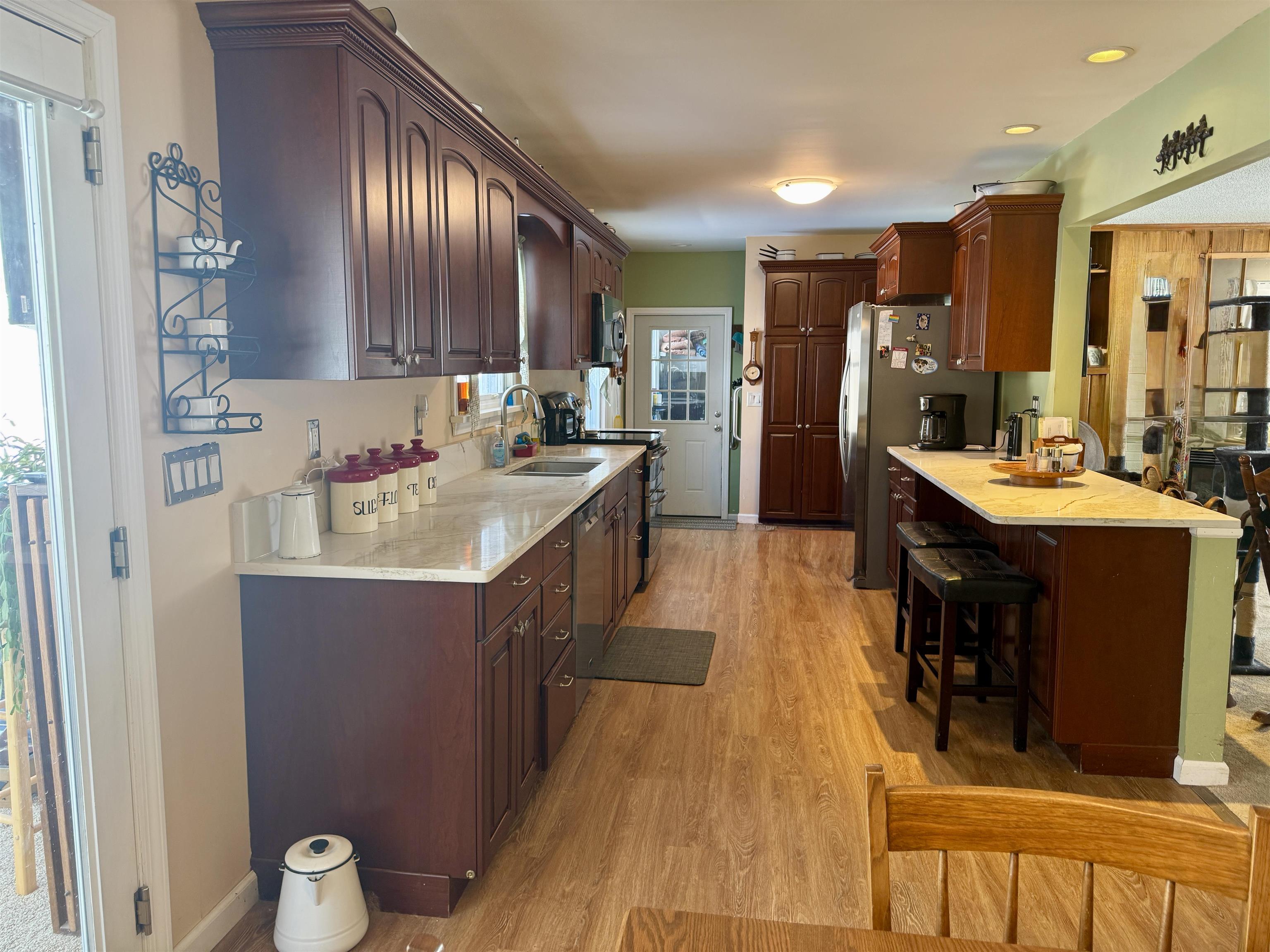 Welcome home to this beautifully updated four-bedroom, two-bath ranch set on an oversized, double-parcel lot. From the moment you arrive, you’ll appreciate the inviting front porch featuring low-maintenance Trex decking and a brand-new picture window that fills the front living room with natural light. Inside, the home offers thoughtful updates throughout. Three bedrooms and the kitchen feature new luxury vinyl plank flooring, with original hardwood floors preserved underneath (excluding the kitchen). The main-floor bathroom has been tastefully remodeled with a modern walk-in shower. The updated kitchen is both functional and stylish, showcasing new quartz countertops, large pantry cabinets, an eat-in dining area, and a spacious coat closet. The dishwasher and refrigerator are just three years old, adding peace of mind for the next owner. The partially finished basement expands your living space even further with an additional 725 sq ft, offering a comfortable suite area that includes a living room area with three closets, a bedroom and a full bathroom. The large egress window floods the space with natural light. There is a dedicated laundry room with a wash sink, and two separate utility/storage rooms. The basement has been completely waterproofed and includes a sump system that drains underground out to the front of the property. Outside, the fenced backyard is an entertainer’s dream. Enjoy summer days by the above-ground pool with a beautifully built deck, unwind in the two-year-old hot tub, spend a lazy day in the heated and air -conditioned four season screened room located off of the kitchen and take advantage of the brand-new Adirondack shed with a concrete floor for extra storage. Additional updates include new gutters diverted underground, upgraded electrical wiring, on-demand hot water, and efficient natural gas heating. This move-in-ready home offers space, updates, and versatility—inside and out—making it a truly special property you won’t want to miss.