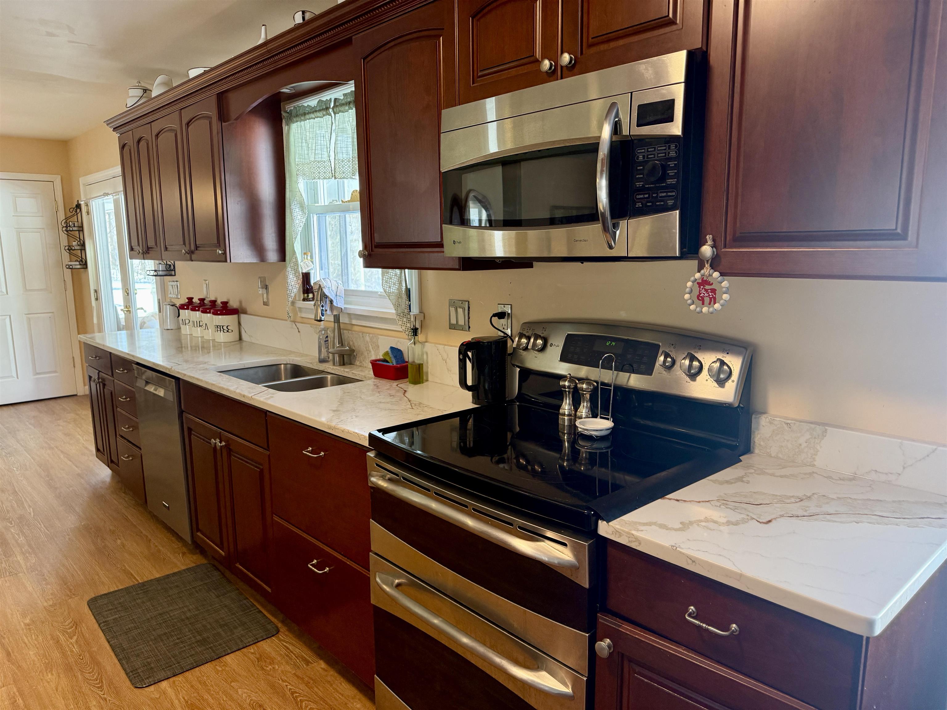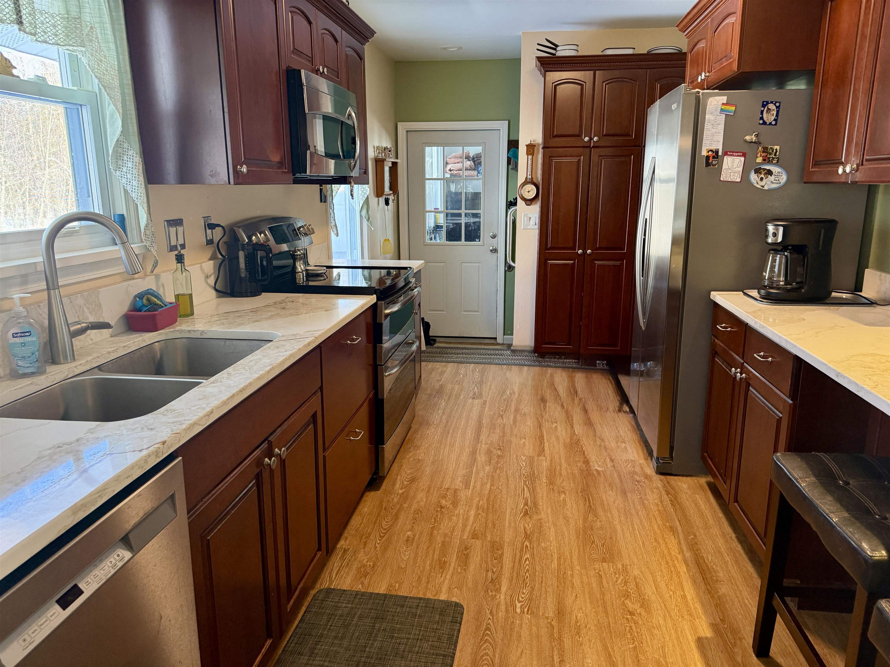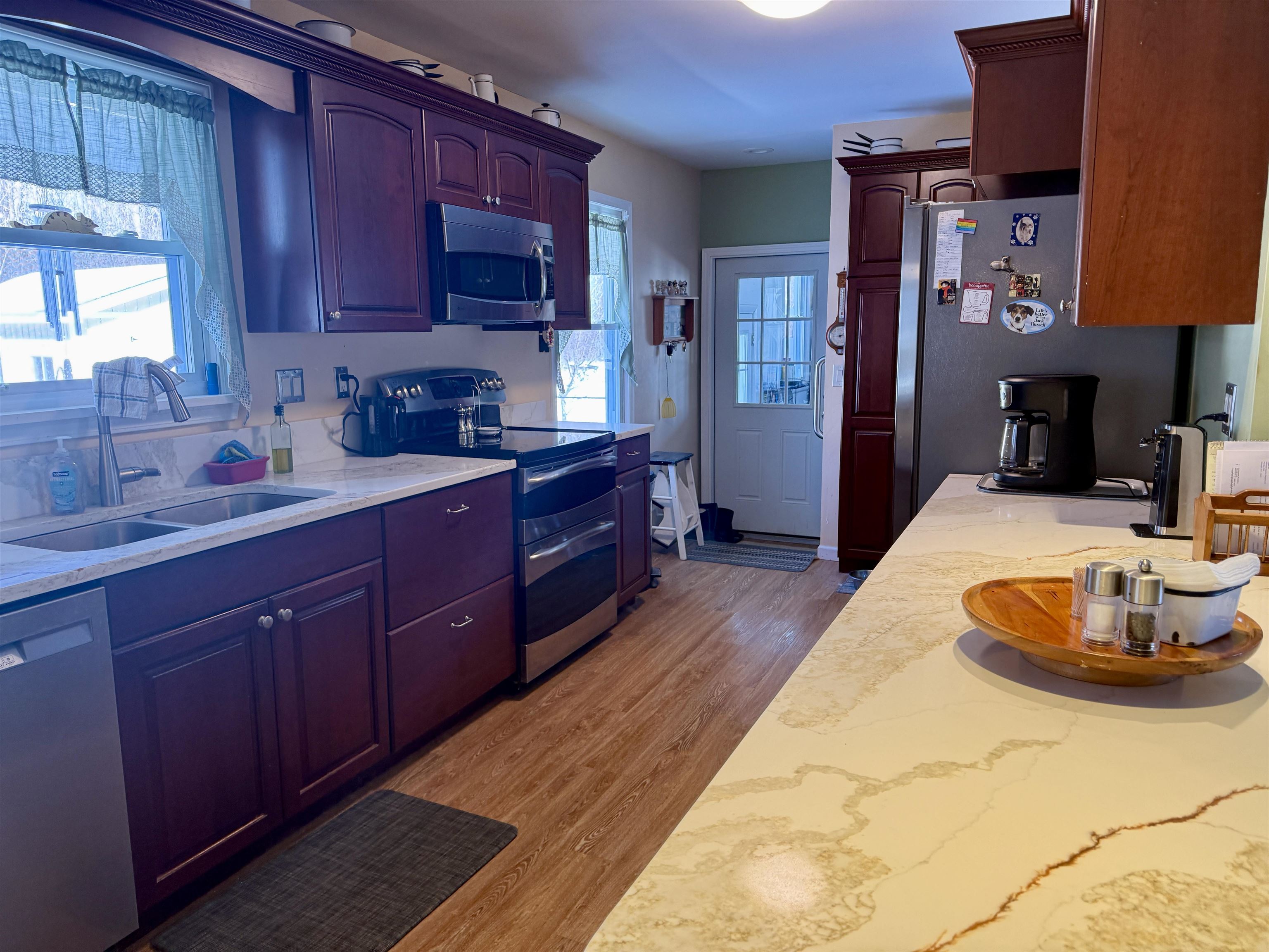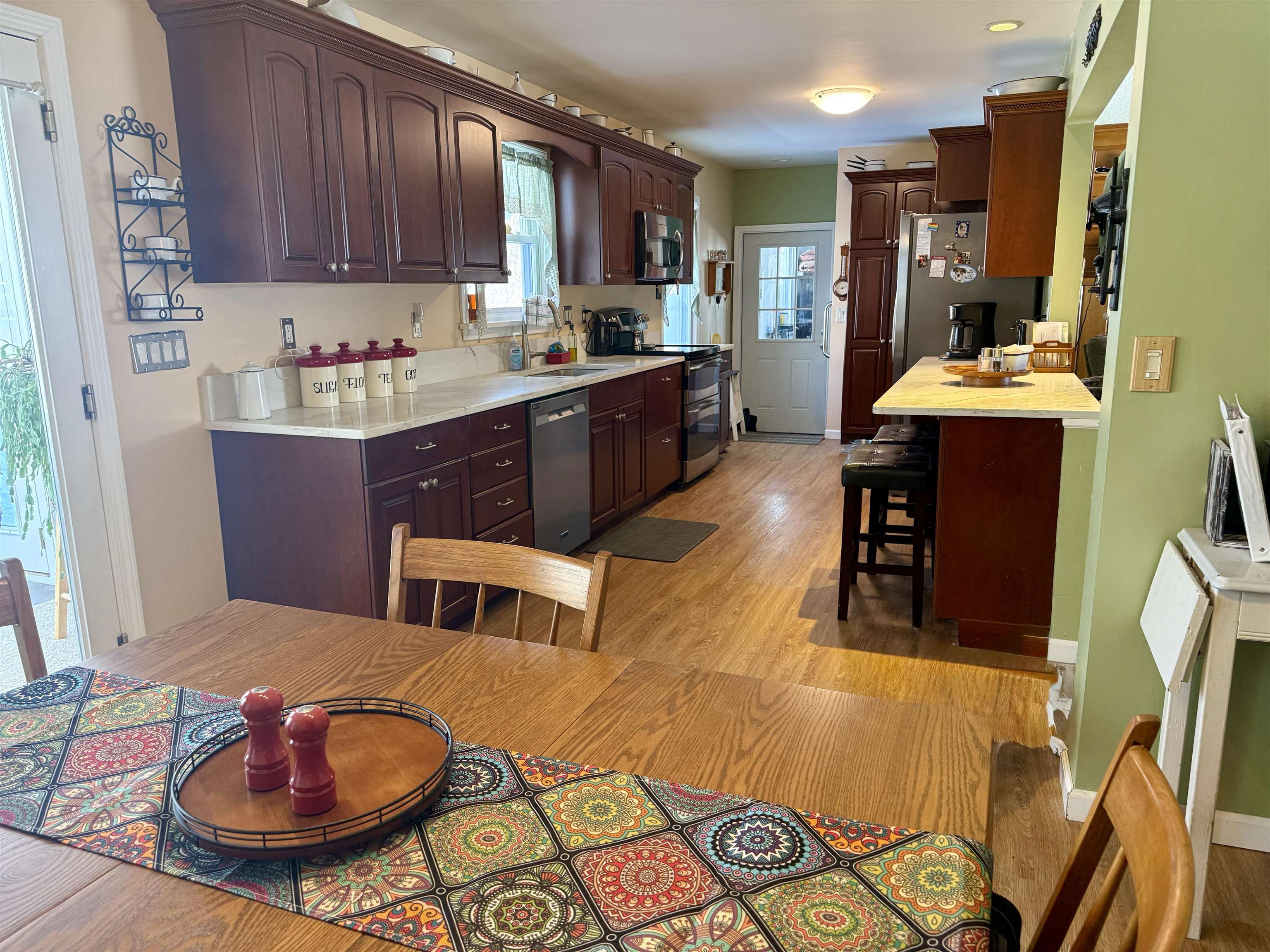 Welcome home to this beautifully updated four-bedroom, two-bath ranch set on an oversized, double-parcel lot. From the moment you arrive, you’ll appreciate the inviting front porch featuring low-maintenance Trex decking and a brand-new picture window that fills the front living room with natural light. Inside, the home offers thoughtful updates throughout. Three bedrooms and the kitchen feature new luxury vinyl plank flooring, with original hardwood floors preserved underneath (excluding the kitchen). The main-floor bathroom has been tastefully remodeled with a modern walk-in shower. The updated kitchen is both functional and stylish, showcasing new quartz countertops, large pantry cabinets, an eat-in dining area, and a spacious coat closet. The dishwasher and refrigerator are just three years old, adding peace of mind for the next owner. The partially finished basement expands your living space even further with an additional 725 sq ft, offering a comfortable suite area that includes a living room area with three closets, a bedroom and a full bathroom. The large egress window floods the space with natural light. There is a dedicated laundry room with a wash sink, and two separate utility/storage rooms. The basement has been completely waterproofed and includes a sump system that drains underground out to the front of the property. Outside, the fenced backyard is an entertainer’s dream. Enjoy summer days by the above-ground pool with a beautifully built deck, unwind in the two-year-old hot tub, spend a lazy day in the heated and air -conditioned four season screened room located off of the kitchen and take advantage of the brand-new Adirondack shed with a concrete floor for extra storage. Additional updates include new gutters diverted underground, upgraded electrical wiring, on-demand hot water, and efficient natural gas heating. This move-in-ready home offers space, updates, and versatility—inside and out—making it a truly special property you won’t want to miss.