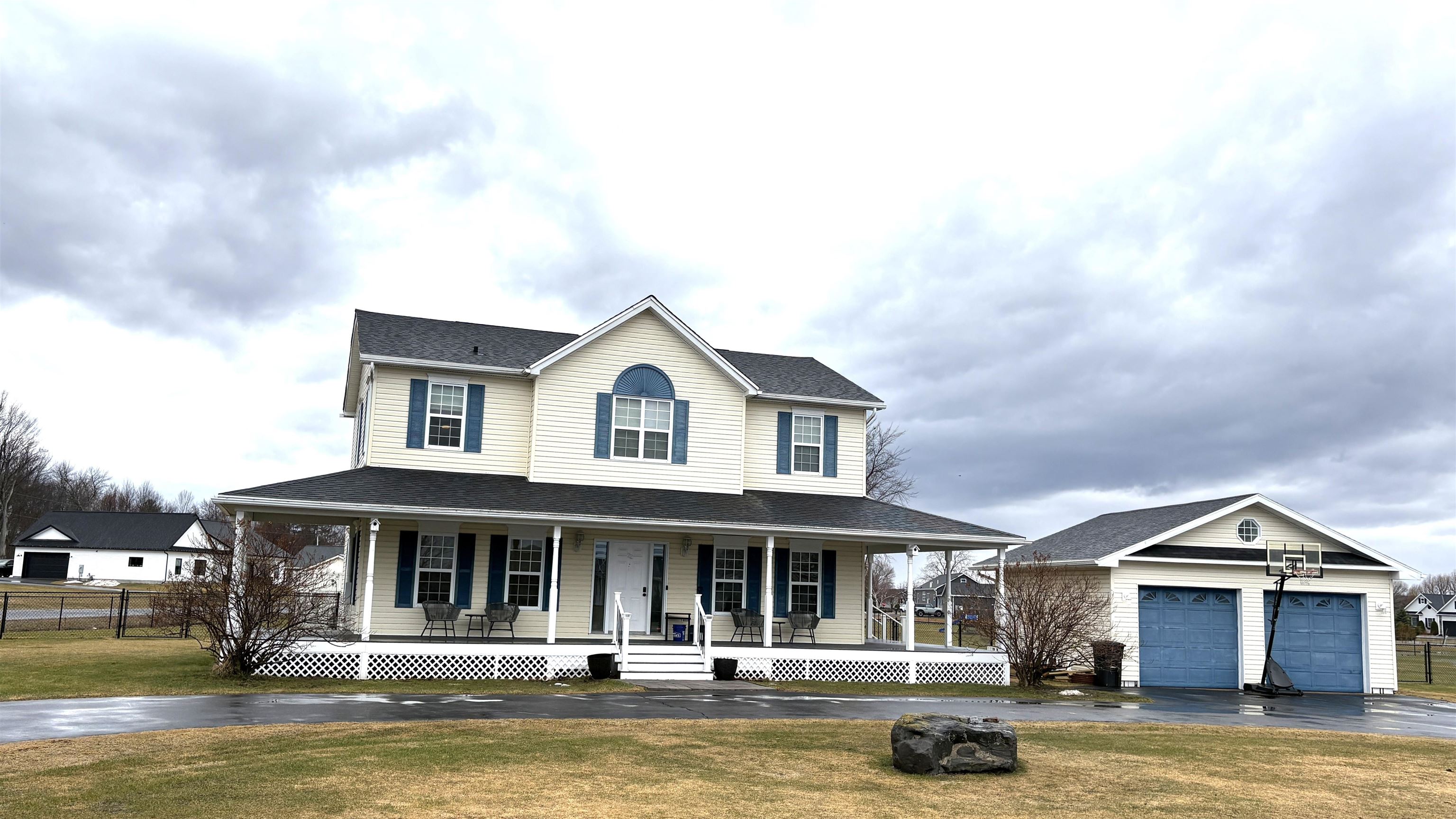 Come see this beautifully renovated 3-bedroom, 2.5-bath home with wrap around porch, 2-stall heated garage and pool. The house includes additional lots (a double lot and single lot) which were originally purchased separately from the home, for a total of 1.69 acres. Updates in 2025 include 1,020 feet of black chain link fencing around the huge yard, a 27 ft pool, a 2-tiered pool deck w/lights, stacked washer/dryer and laundry room sink. The garage was recently spray foamed insulated and a propane heater added making this a fantastic recreation room in the winter. Other previous years' updates include flooring, remodeled bathrooms, updated kitchen appliances, composite decking, light fixtures, patio door, stair treads, roof shingles and seamless gutters (detailed list on the PCD). The house layout has a main floor living room with a natural gas fireplace, family room, kitchen, half-bathroom, laundry/utility room and dining/sunroom. On the second floor is the master bedroom that accesses a private bathroom with a jetted tub and separate walk-in shower; two more bedrooms and an additional full bathroom. Other features include a circular paved driveway, a fenced garden area, and a playset for kids. There’s an on-demand water heater and a water softener connected to the municipal water and sewer service. The Village owns a 60’ wide lot across the road in front of the home to access the river. With 180 degree views of the St. Lawrence River, this is a highly sought after area and is centrally located between Ogdensburg, Massena, Potsdam and Canton. Call today to schedule a showing!
