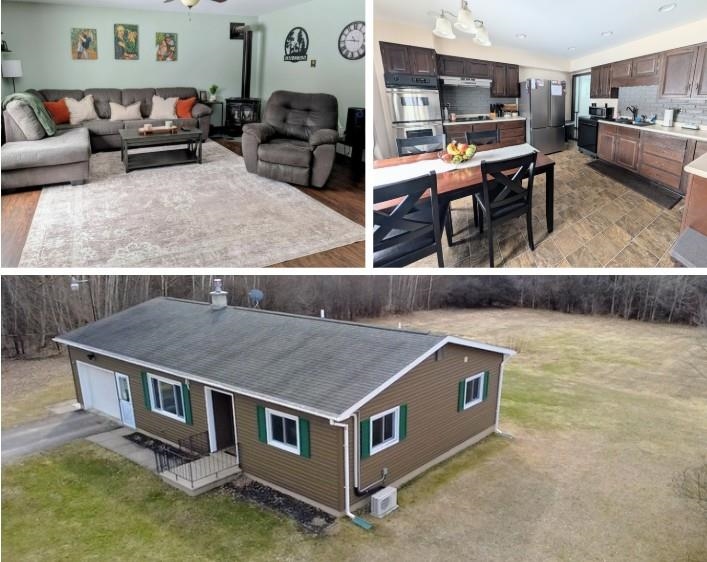 Back on the market—no fault of the home or seller! The previous buyer’s plans changed, creating a new opportunity for you. This property was moving smoothly through the process and is ready for its next owner. Don’t miss your chance—schedule a showing today Welcome to this well-maintained ranch home set on nearly 3 acres, offering the perfect blend of comfort, space, and privacy. Step inside to a bright and inviting living room featuring laminate flooring, a cozy standing propane gas stove—perfect for those cooler North Country days. A newly installed mini-split provides efficient air conditioning in the main living area, while two portable AC units (convey with the sale) keep the bedrooms comfortable all summer long. The spacious eat-in kitchen is ideal for everyday living and entertaining, complete with updated appliances, including a brand-new built-in double oven, a brand-new portable dishwasher, a large refrigerator, just 1-year-old, a pantry, and a large picture window overlooking the peaceful backyard. The main level also offers two comfortable bedrooms and a beautifully renovated full bath, updated by the previous owner, featuring a tub with glass shower doors and a stylish vanity. Downstairs, the partially finished basement provides fantastic additional living and entertainment space. Enjoy a custom bar area with a bar fridge, an electric fireplace, large TV with sound bar (convey with the sale), perfect for gatherings. With a separate finished room featuring a pool table (included), along with multiple storage closets offer plenty of space to stay organized. There is a brand new washer and dryer also located in the basement, which also comes with the sale. Additional updates include a water filtration system and radon mitigation system for added peace of mind, installed by the previous owner. Step outside and enjoy the expansive, beautifully maintained backyard—perfect for outdoor activities, gardening, or simply relaxing in your own private setting. To make upkeep a breeze, a 2020 Cub Cadet ZT1 54" zero-turn lawn mower is included with the sale. The seller is also leaving an underground dog fence and collars all ready to go to keep your pets safe. The outdoor space also features a charming stone patio complete with a mechanical awning, offering comfortable shade on sunny days—ideal for entertaining or unwinding. For added peace of mind, a Ring security system with integrated floodlights is also included. This move-in ready home offers space, comfort, and thoughtful updates—all in a peaceful setting just minutes from local amenities. The home has electric baseboard heat, excellent for zone heating, along with the propane gas free-standing stove in the living room.