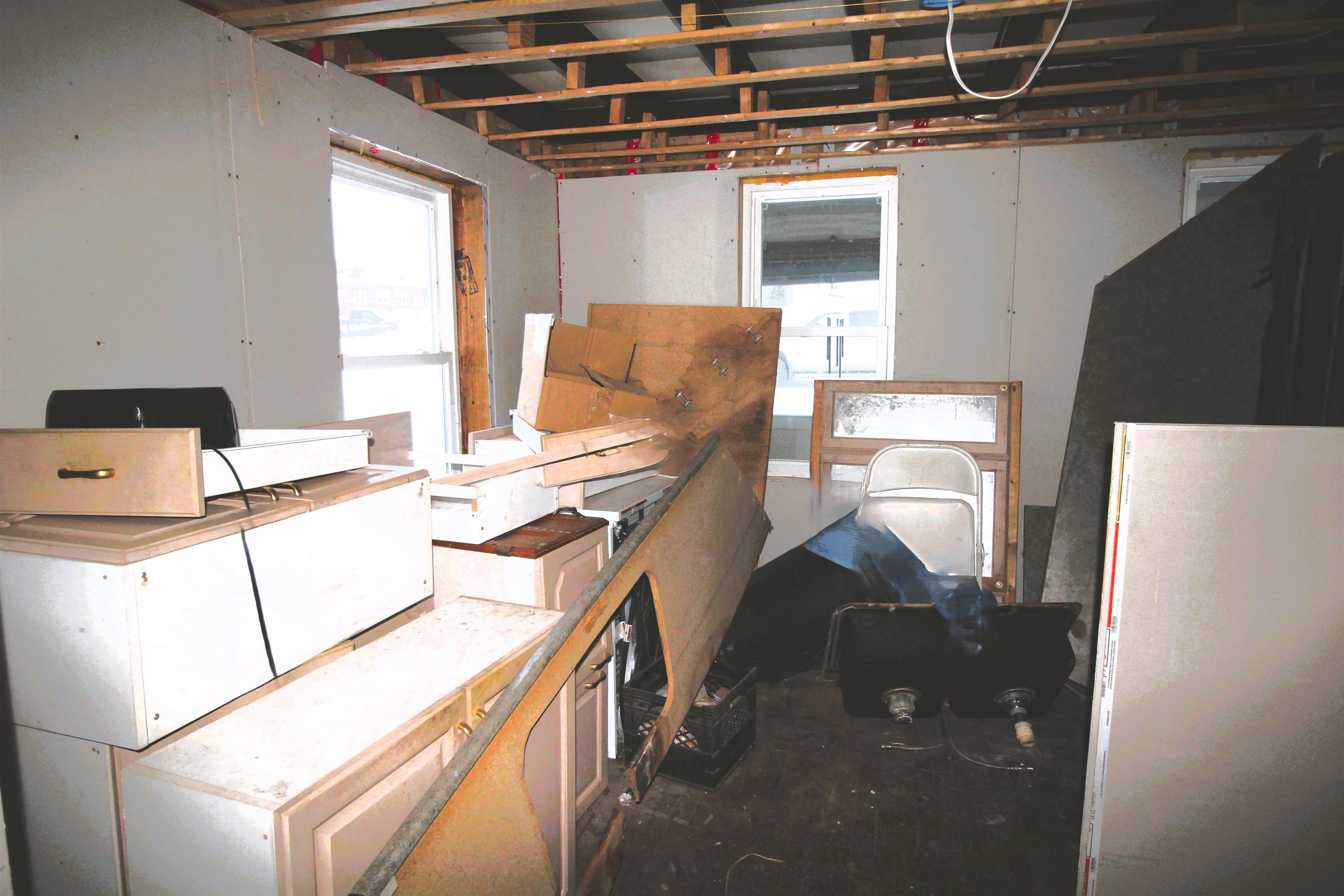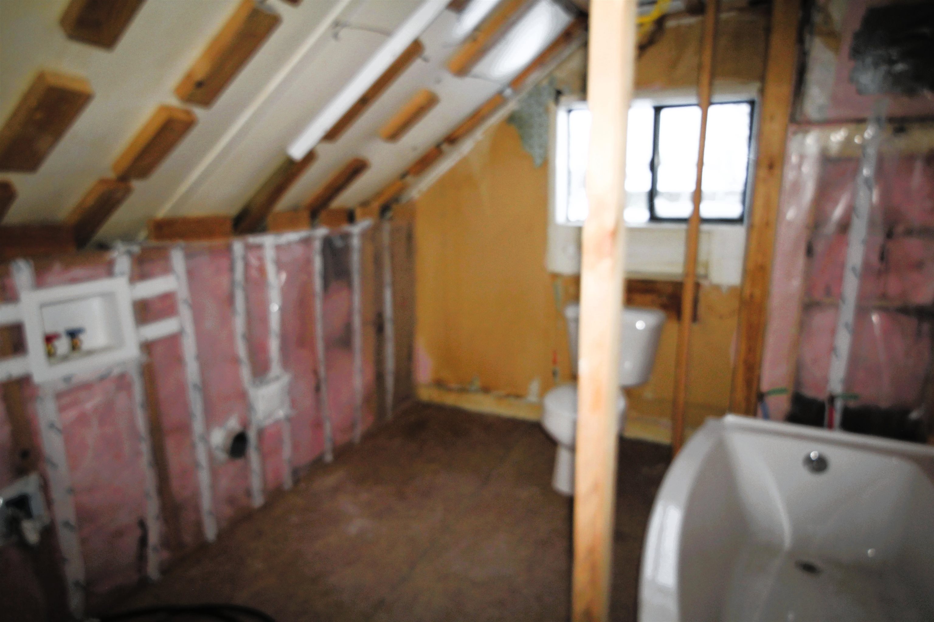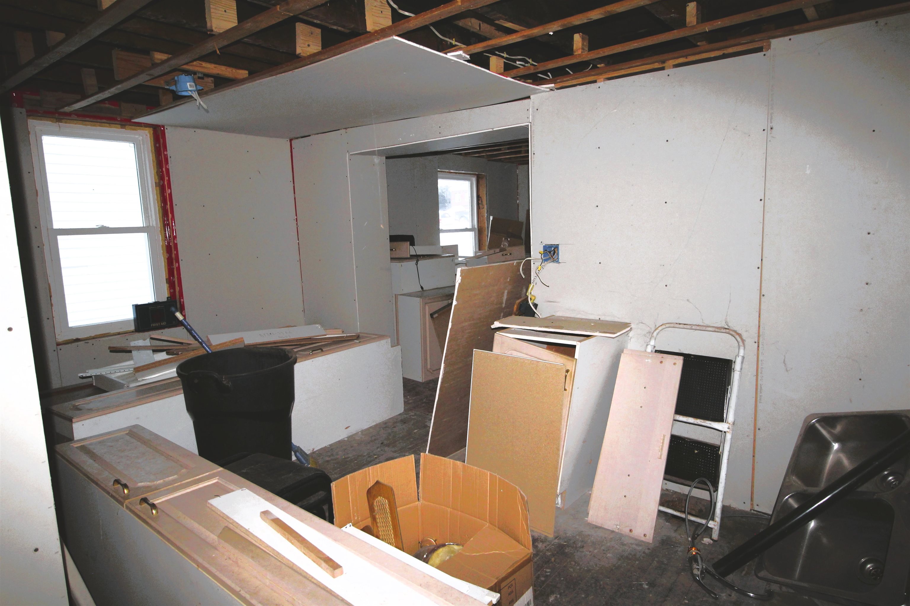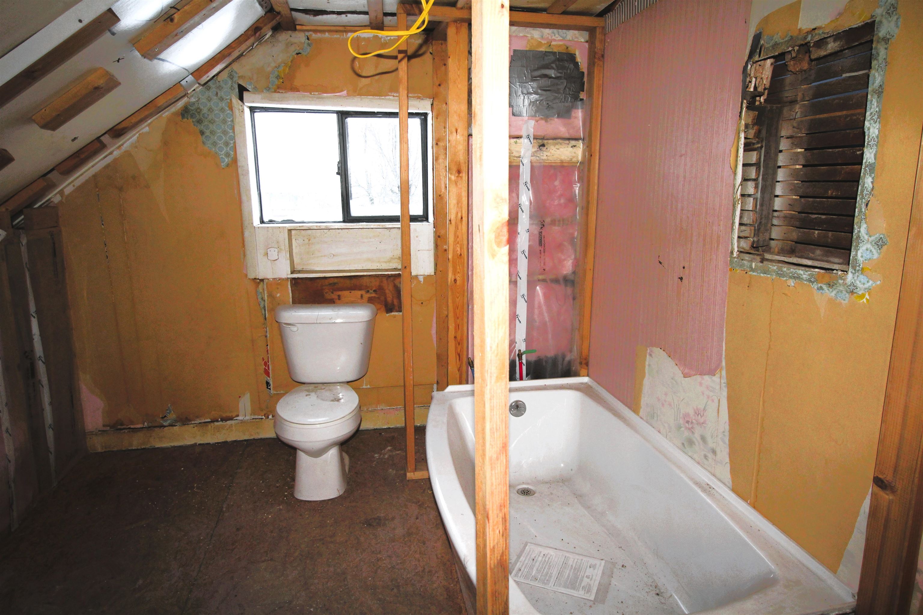 A perfect project! This home is ready for sheetrock and the finishing touches. All buiding materials onsite will stay- Cabinets, Bath Fixtures, sheetrock and more. The ist follr has a den/ diningroom, Kitchen, huge livingroom. Upstairs is a full bath with laundry area and two bedrooms. The double lot is huge. It runs from Main Street to the entire corner of Jackson St.