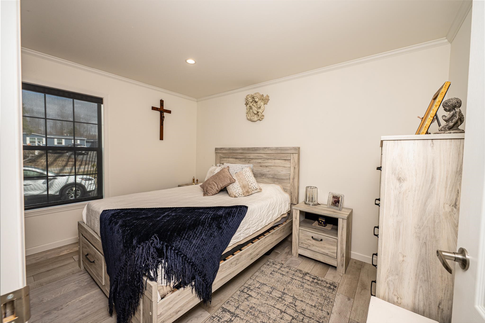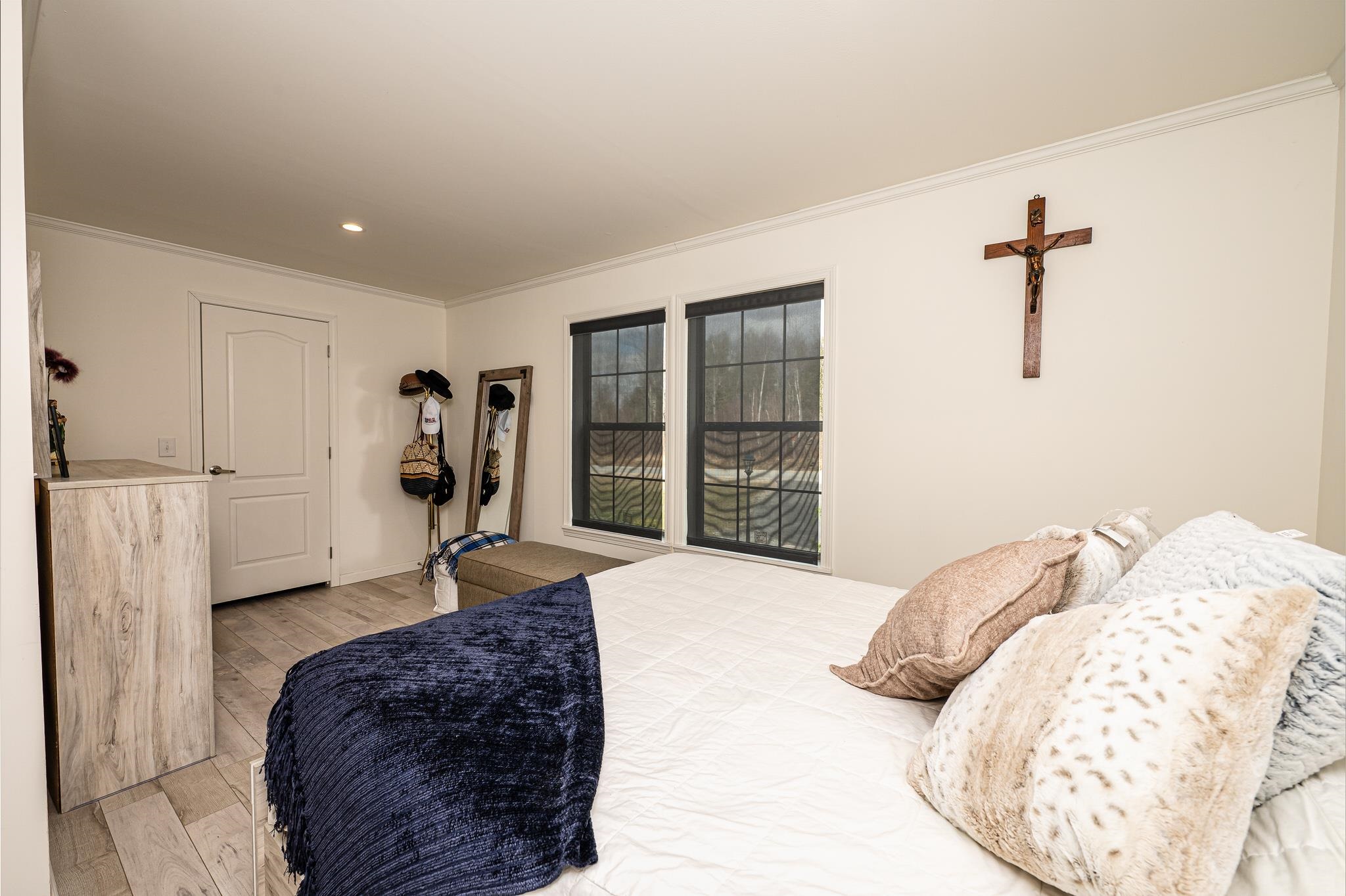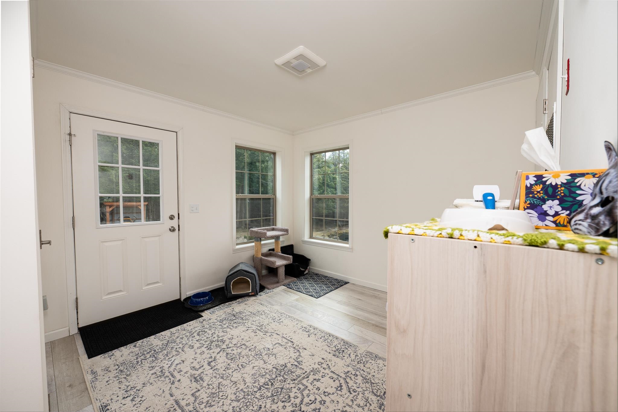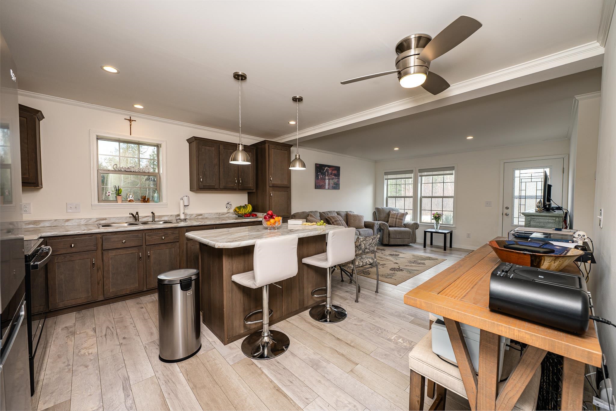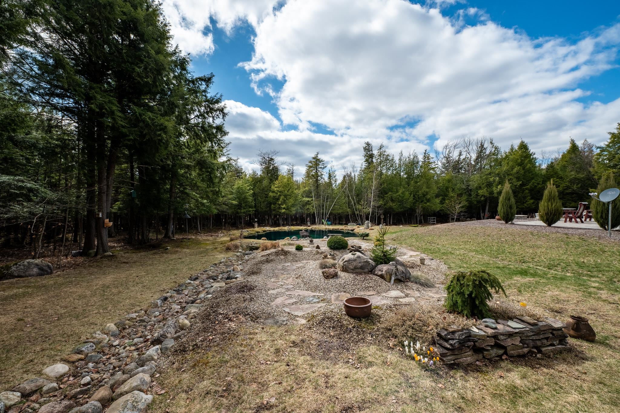 Welcome to this beautifully maintained 2-bedroom, 1-bath home situated on an expansive 30-acre parcel at 130 Fisk Rd in Nicholville, NY. Built in 2021, this property offers the perfect blend of modern efficiency, quality craftsmanship, and peaceful country living. From the moment you arrive, you’ll appreciate the home’s attractive board and batten vinyl siding, along with the convenience of a paved wrap-around driveway providing easy access and ample parking. The grounds have been thoughtfully landscaped with stunning conifers that enhance the natural beauty of the setting. Inside, no detail has been overlooked. The home features gorgeous Armstrong waterproof laminate flooring in the sought-after Prizm color, offering both durability and style throughout. The open and functional layout is complemented by high-quality systems designed for comfort and reliability. Enjoy year-round peace of mind with a Kohler whole-house generator that automatically activates during power outages. The high-efficiency heating and central air system includes an Amana 2.5-ton compressor and evaporator, with the central air component newly installed in 2025, ensuring modern comfort in every season. Adding to the property’s charm is a stunning 45-foot diameter artesian-fed pond, creating a serene focal point and a perfect place to relax and enjoy the surrounding nature. A beautiful hand-crafted log shed adds both character and practical storage, perfectly complementing the property’s rustic appeal. With 30 acres of land, this property offers endless possibilities—whether you’re seeking privacy, recreation, or future expansion. This is a rare opportunity to own a thoughtfully designed, move-in ready home with premium features in a peaceful setting.
