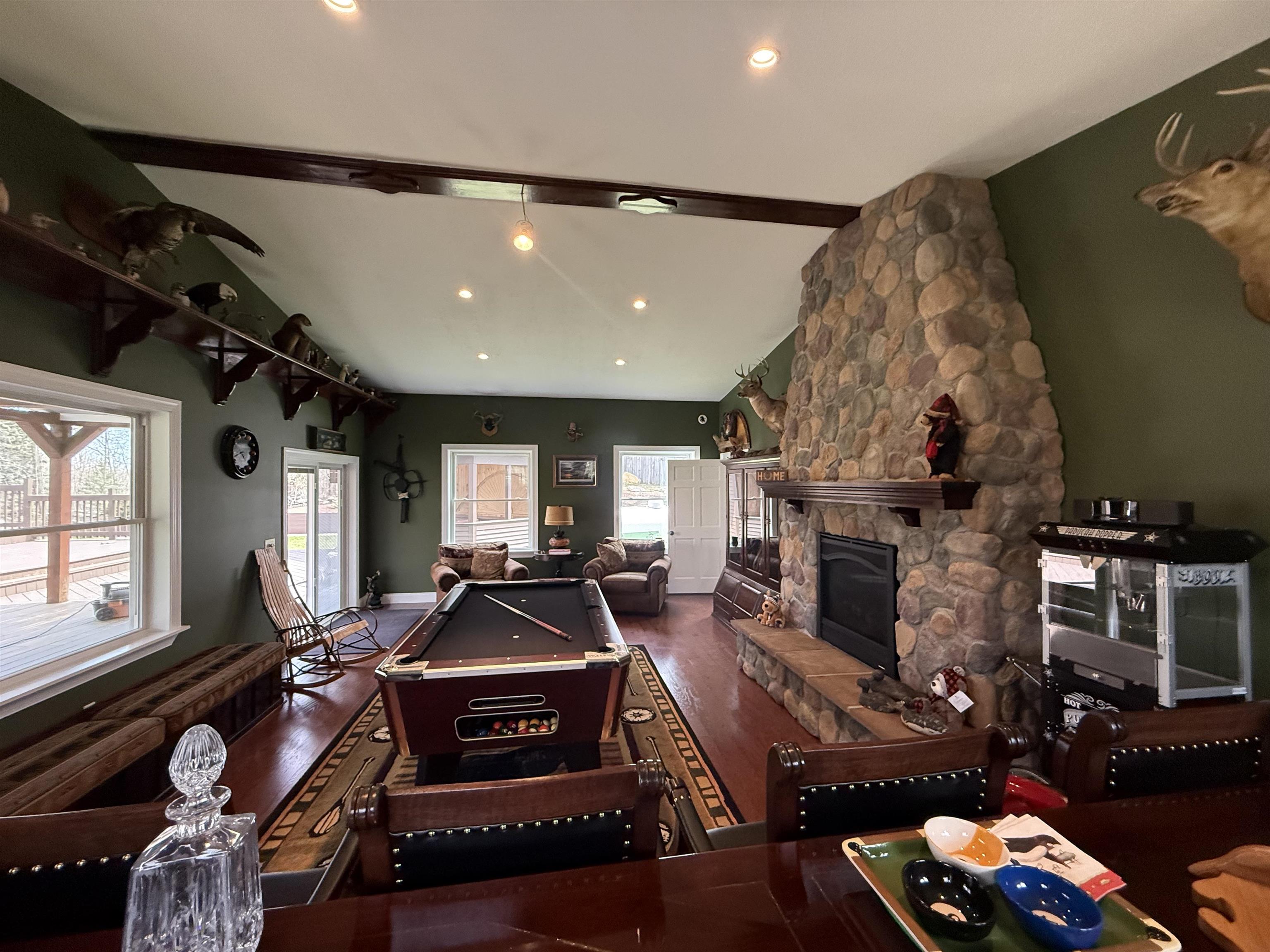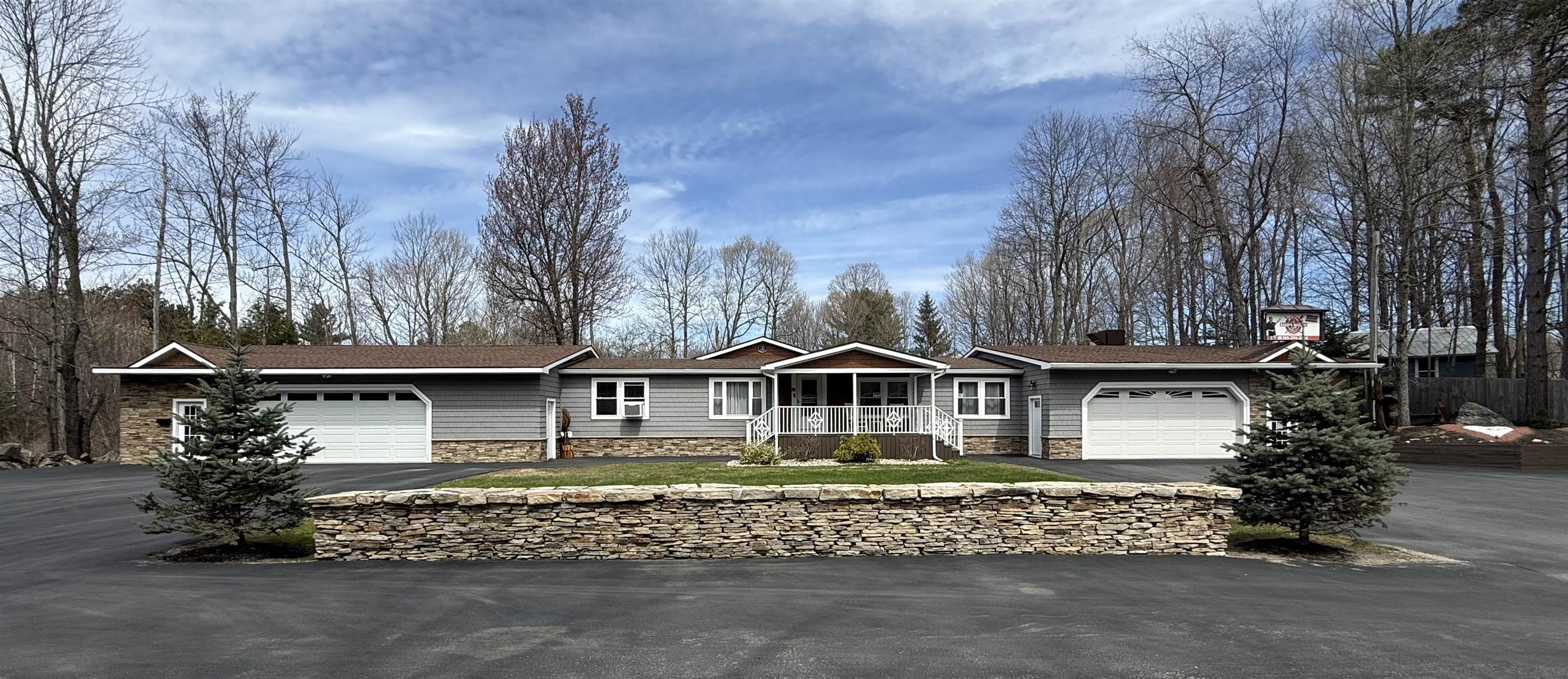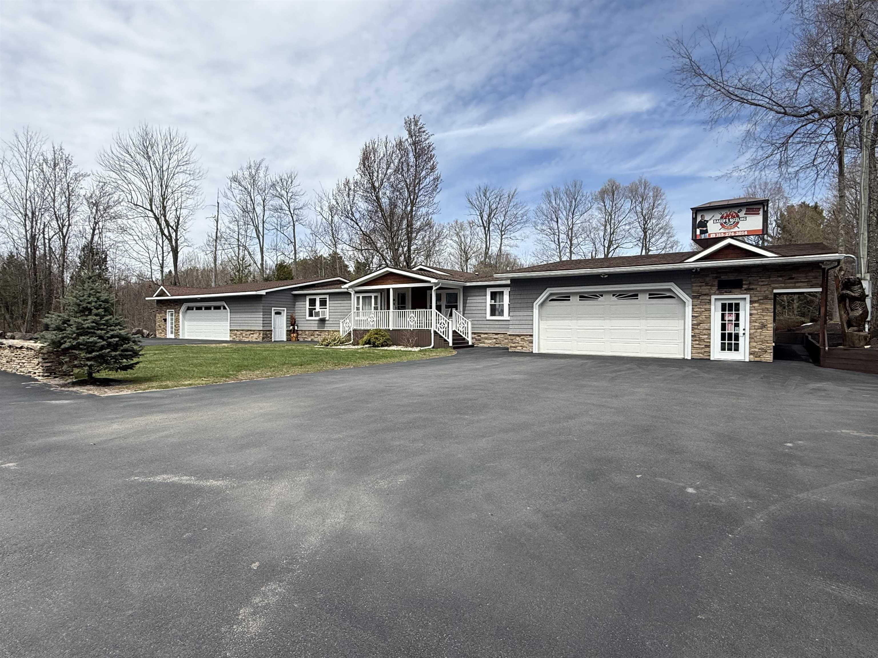 This PRICED TO SELL listing offers buyers a unique and rare opportunity All in one purchase! Imagine...Working for yourself or having a manager... taking over (turnkey) Baker's Sizzling Grill (no expense was spared for all the still immaculate, state-of-the-art equipment that was installed brand new 4 years ago, plus an accessible reception and checkout area with fire and water feature, prep room and its own garage for storage and deliveries and separate employee entrance, 1/2 bathroom, paved and lined parking lot ...established as a thriving take-out restaurant with an excellent reputation and consistent, (profitable sales records to prove it). Attached to a dream, quality, remodeled and constructed, meticulously maintained 3/4-bedroom (one is the primary suite with cedar walk-in closet and new primary bathroom with double vanity and walk-in tile shower), (split floor plan- primary at one end, 2 bedrooms and office or 3 bedrooms and full bathroom at the other) living space with a modern kitchen featuring quality hickory cabinets, solid surface countertops. travertine tile backsplash, walk-in pantry, peninsula with breakfast bar and 4-piece appliance package that stays. The addition...down a few decorative, hand-crafted cherry stairs is a magnificent 22' x 30' living room with propane fireplace, giant bay window with a seat and hand-scraped cherry hardwood floors leading to a one-of-a-kind 18'x 30' recreation room with gorgeous floor-to-ceiling stone fireplace with a propane insert, wall length bench seating, high shelves for collectibles and a gorgeous bar and Amish crafted stools that stay; this takes you to the exit to your resort like, difficult to describe backyard oasis complete with an Adirondack style covered deck - stepping to decking encircling the 18'x40' oval above ground pool, leading to an octagon hot tub enclosure with benches and inlayed wood features (owner unsure if the hot tub works), paver stone pathways to the pre-fab concrete-cooking fireplace and enormous easily maintained elevated garden/sitting area with waterfall leading to a pond. With all of that there's still plenty of lawn all outlined by large stone features. Not mention the 3-year-old, 44' x 40' insulated, finished heated garage addition with 2 addition finished office spaces. The home is sided with cedar shake vinyl siding on top and decorative dry stack stone siding on the bottom; the covered front porch features a very attractive custom designed wood ceiling with recessed lights. The roof and circular paved driveway/ parking lot are 3-yearsold. The curb appeal is outstanding with the dry stack stone wall and land scaping as welcoming features, displaying the pride in ownership that is evident throughout the entire home and business. Everything for the business conveys with the sale and most furnishings in the home are negotiable. Qualified buyers are encouraged to do themselves a favor and schedule a showing to see this remarkable opportunity situated near the Racquette River and many state parks in the foothills of the Adirondacks.